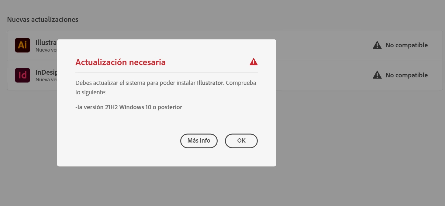 No me deja actualizarlo a la última actualización Illustrator 29.0.1, me sale el mensaje " versión 21H2 windows o posterior" y tengo instalada la versión windows 11 Pro.