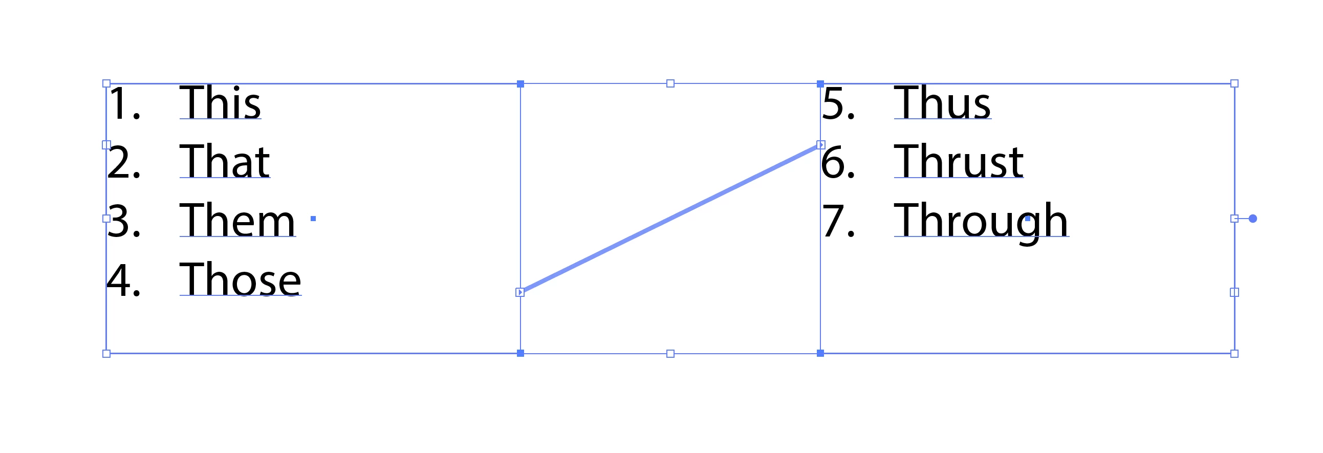 I'm trying to create the headers of an index in Illustrator. So, I'd like a numbered list with all my sections and then be able to break up that list into individual text boxes, so I can list the subsections below. Something like this: