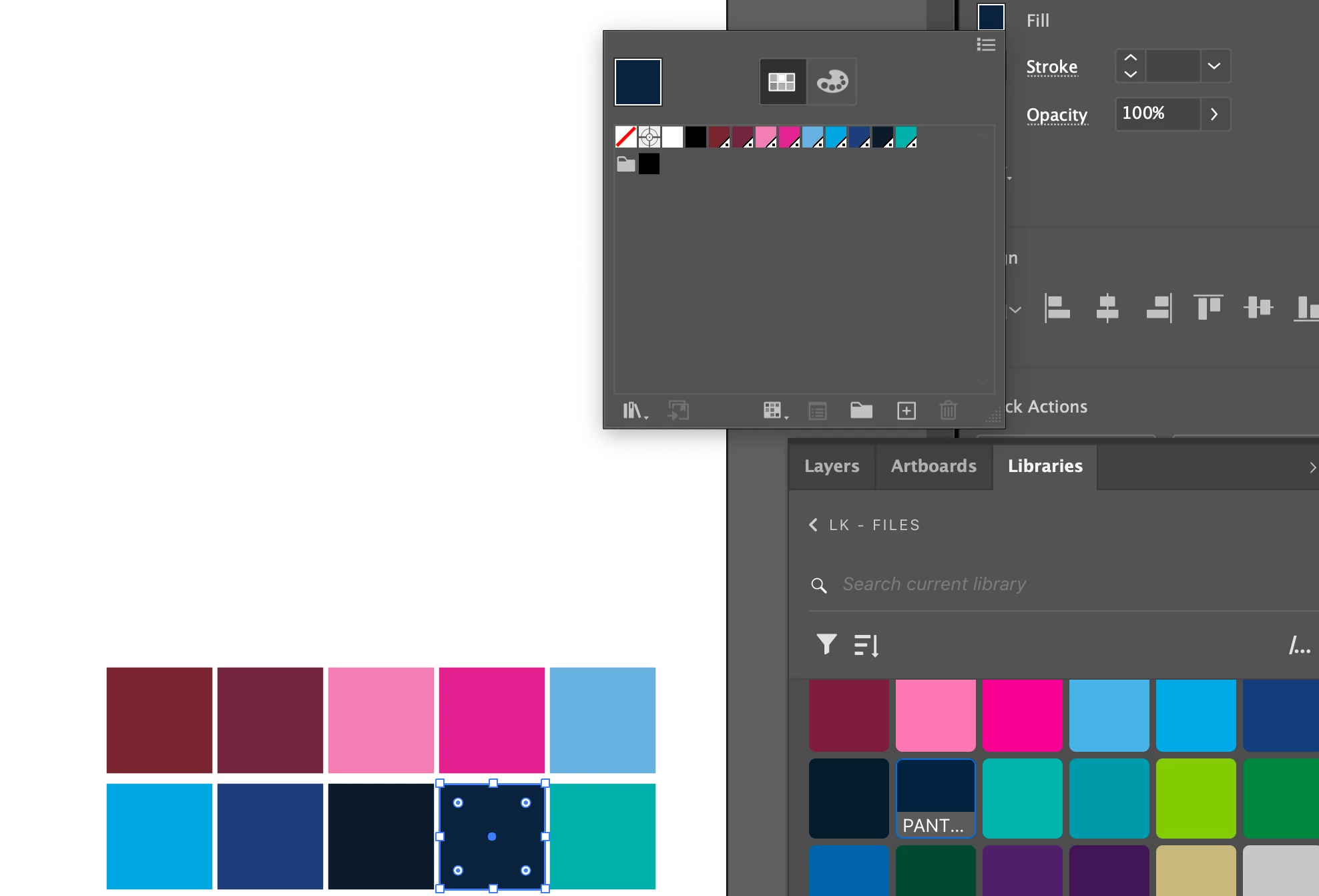 I have a set of custom spot colors I have saved in my Creative Cloud Libary that I pull into projects to use. They have all historically populated the swatch panel with no issue, but now suddenly one of them (the navy one in the screenshot) isn't populating anymore. I click on the color swatch in my CC library and it colors the selected item that color, but there's no swatch associated with it anymore. It used to populate a color swatch for every color I used in my swatches as I used them. Why is just this one not working anymore?