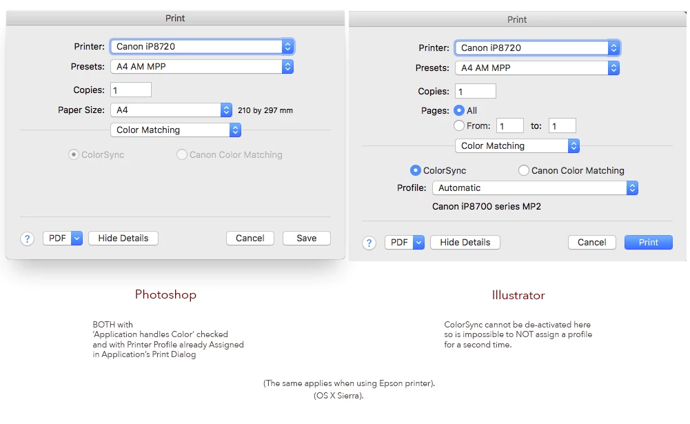 Using same printer, same (Custom) Profile and same procedure as used faultlessly in Photoshop, I find that, having set Illustrator to handle Color for printing, and properly assigning profile, when I go then to Printer Settings, ColorSync is not greyed out. No matter what I try It seems impossible to not assign a profile a second time, and so making a print with wholly incorrect color!