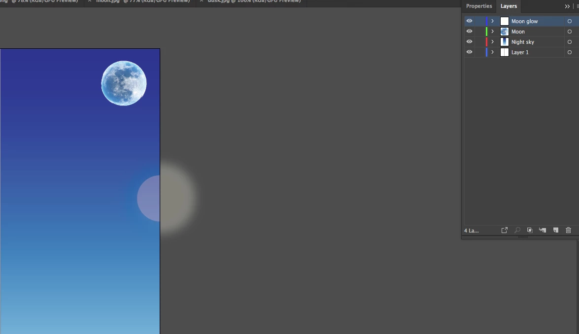 Click on the moon element, go to appearance (window - appearance) look at the outer glow opacity. click on it opacity. at the bottom there are boxes you can check, make sure isolate blending is selected. it should work.