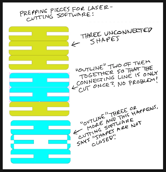 Outlining two of the shapes creates no issues, but if I outline three it changes what seems to count as inside and outside of an otherwise closed shape. The cutting software can’t cut saying that (paraphrasing) the file includes shapes that aren’t closed.