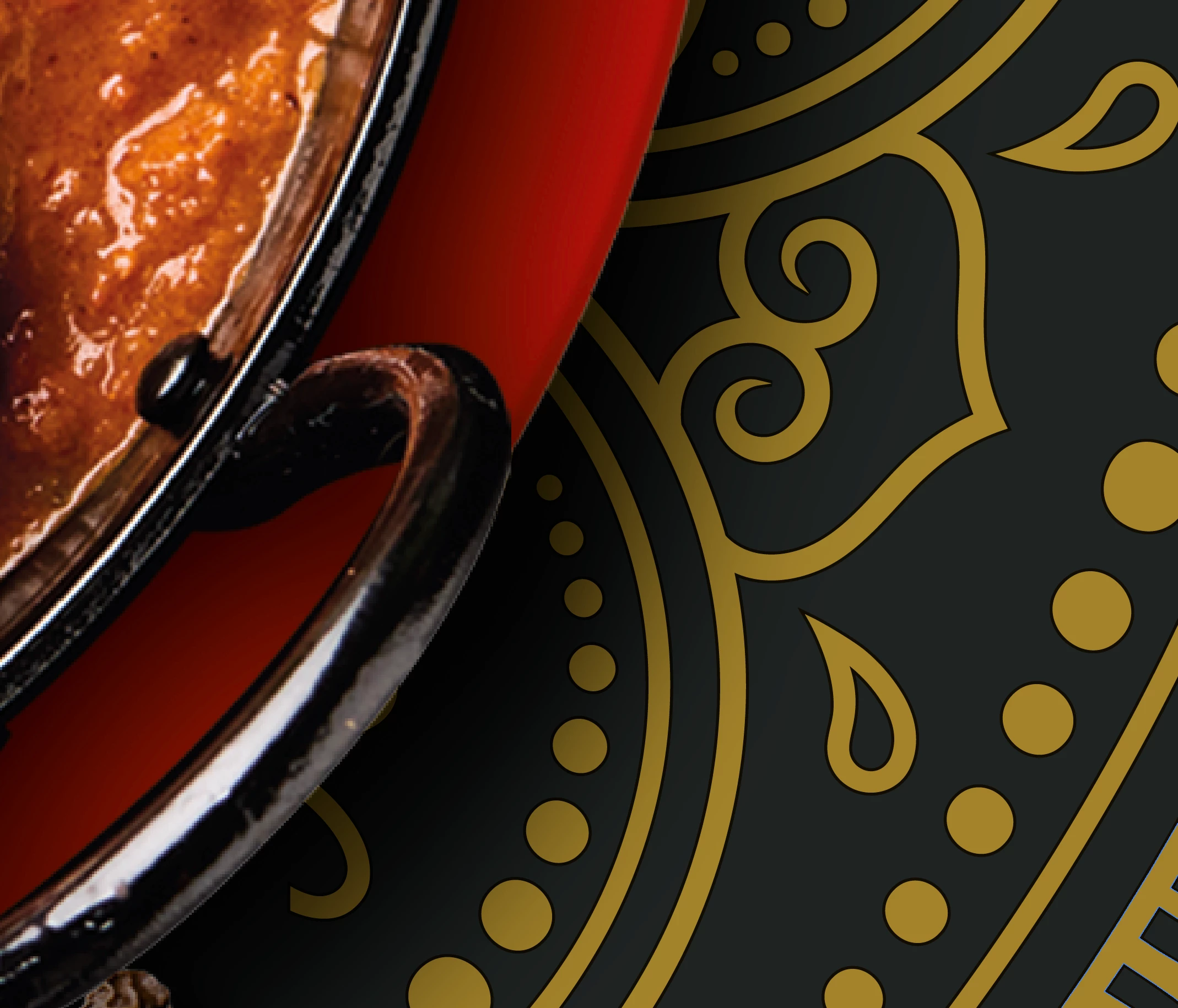 I'm trying to set up up an Illustrator file for a packaging artwork. The job is litho CMYK + 2 Pantone spot colours. The Pantones are 419 C and 8641 C (8461 C is metallic). The sequence of printing is (according to the printers repro guide) is K, C, M, Y, Spot, Metallic. My artwork (partial image shown below) is a CMYK image with 419 C as the background colour (basically almost black) with a metallic gold pattern (8641 C). As you can see from the image I've got overprint (0.1mm) set on the 8641 C). My question is what do I do about the shadow from the Karahi dish which is on top of the 419 C and Metallic Gold (8641 C)? I don't think I can use black as that is the first colour printed (So I'd someone have to reverse out). I want to use the 419 C to overprint the Gold, but the gold goes down last. I assume the gold will be quite opaque, so I'm not sure how the shadow (419 C) will come through with the gold on top? I suppose I could leave tiny holes in the gold for the black to come through but how would I set that up. I'm stumped. I suppose I'm hoping the printer could swop the 2 spots so the gold would go down first with the 419 C on top. But I bet this is because the metallic ink doesnt like having an ink on top of it? Any thoughts greatly appreciated.