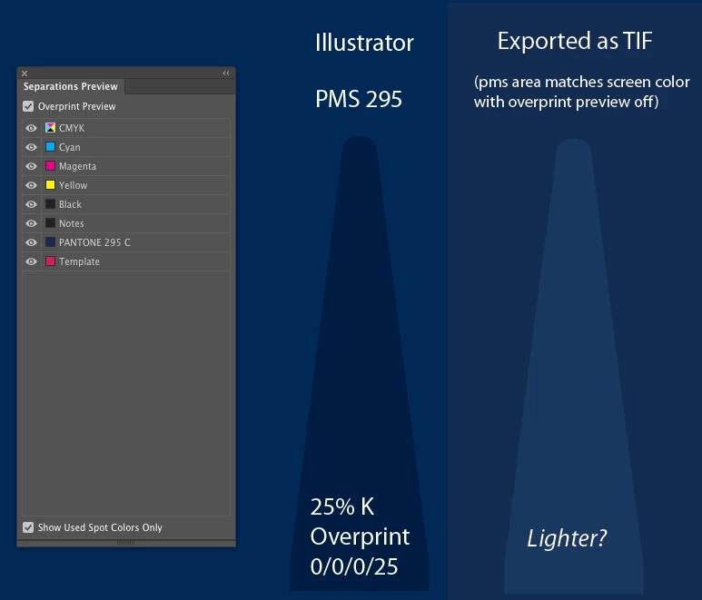 Pantone 295C (book color) with 25% K overprint. Previews fine but any raster exports invert the effect, making the overprinting art lighter than the surrounding color, when it should be darker.
