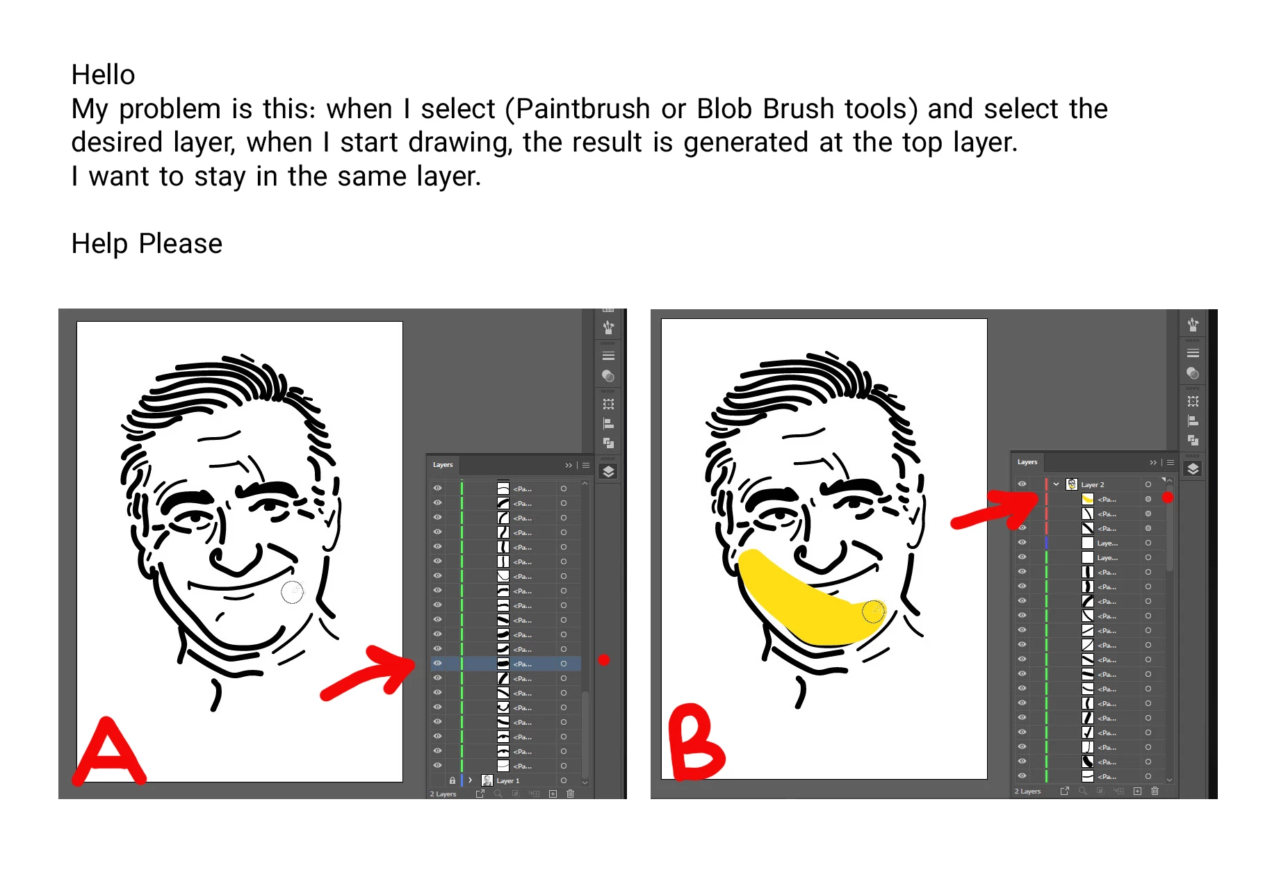 My problem is this: when I select (Paintbrush or Blob Brush tools) and select the desired layer, when I start drawing, the result is generated at the top layer.