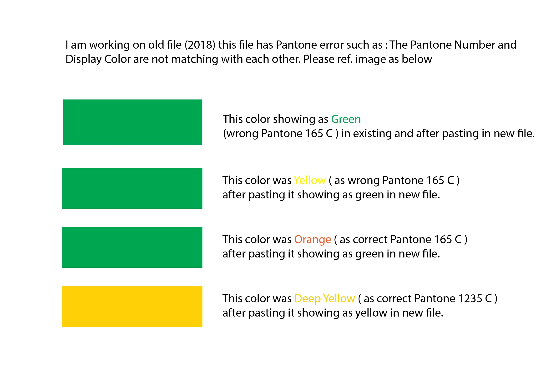 I am working on old file (2018) this file has Pantone error such as : The Pantone Number and Display Color are not matching with each other. Please ref. image as below.