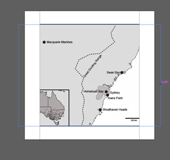 But what I see is not the full map. In the image below it should extend to the left and right of what is shown and I can select that region with the mouse and you can see the extended bits with the blue selection parimeter. But when I click on that blue parimeter AI says "No selection."