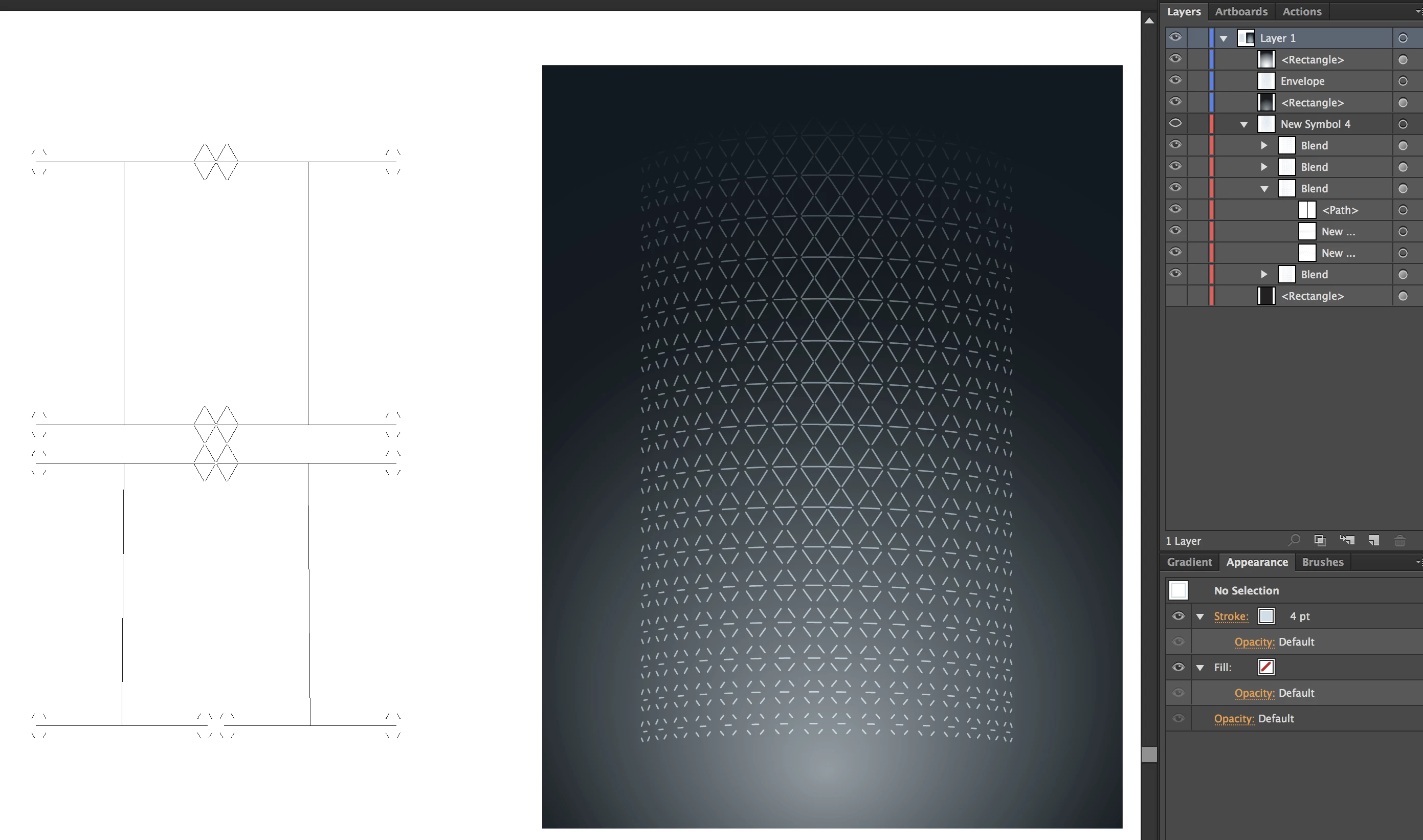I need to create in Illustrator that kind of pattern effect: I can not find a solution to blend the pattern from the center to the sides. Does anybody has an idea ????