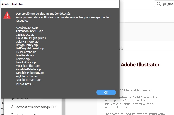 Lors du lancement d Illustrator nous avons un message « Problème de Plug-in ».