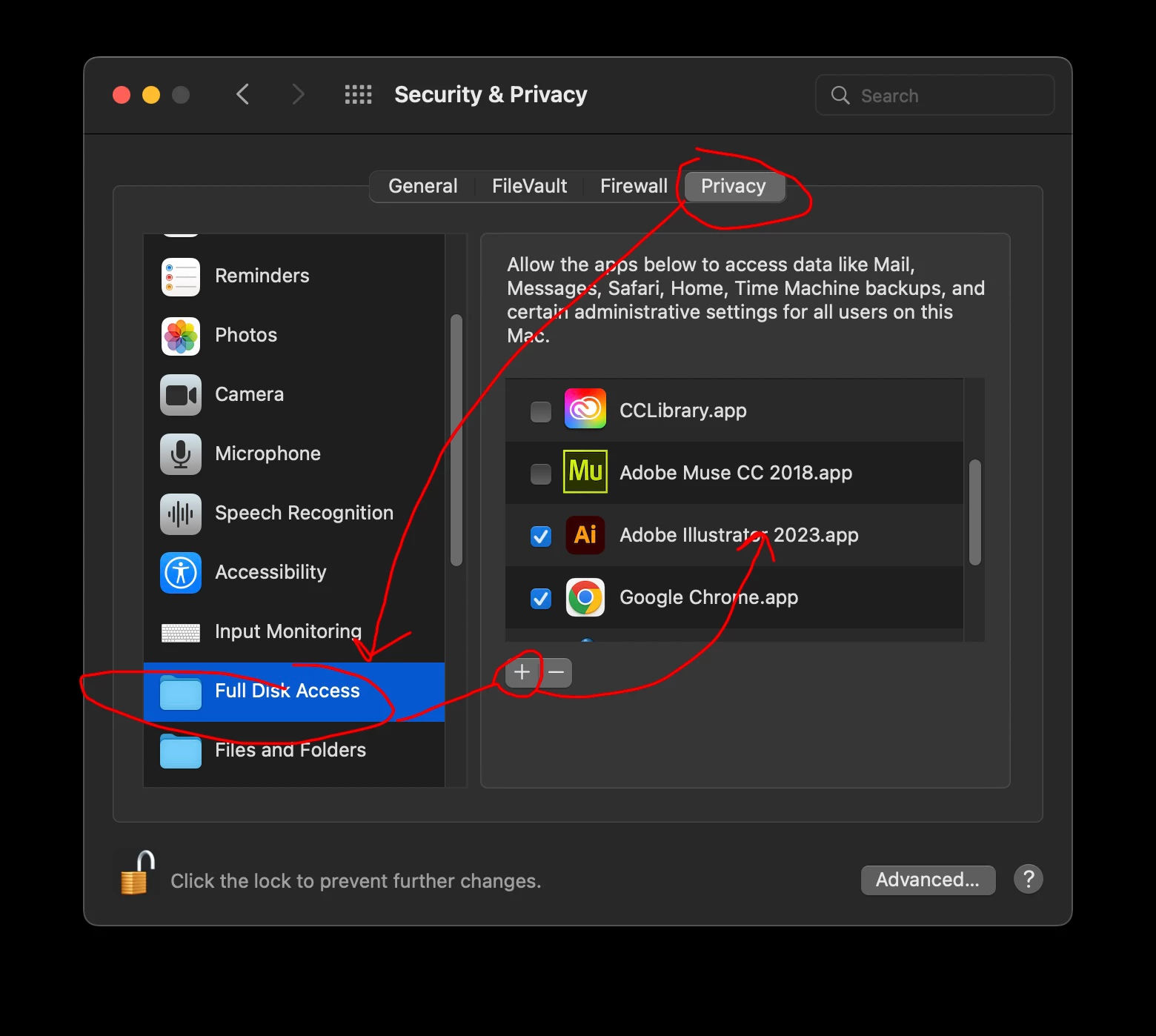 Your issue defintely lies in adjusting Security & Privacy Preferences. I believe Full Disk Acess is the one to add Illustrator will resolve your issue.