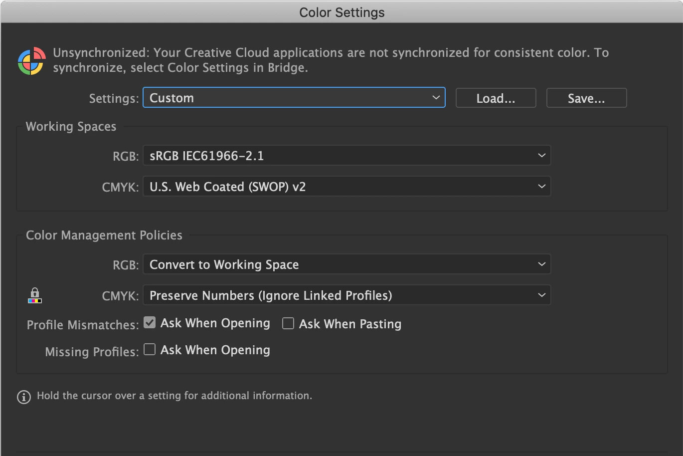 I have been trying to find solutions on this forum, and have tried: Opening it in photoshop and resaving, then opening in illustrator (doesn't work). Checked and fiddled with colour management settings which are currently as follows (which to the best of my knowledge is how they should be) and haven't had any results: