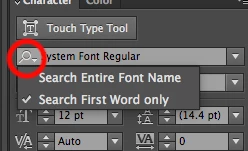I have installed typekit and it's great but now I can't search my system fonts in the character palette or in the top menu. The only way to see my system fonts is to go to type menu form the top drop down which is a tedious and painstaking way to search fonts. it has limited the range of the search to typeset only. Please help me
