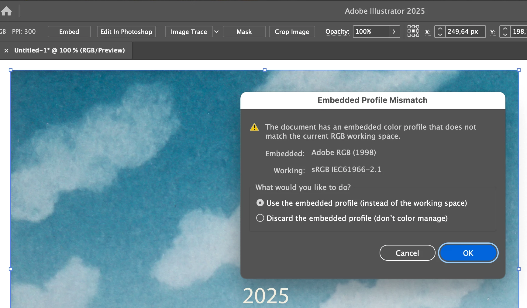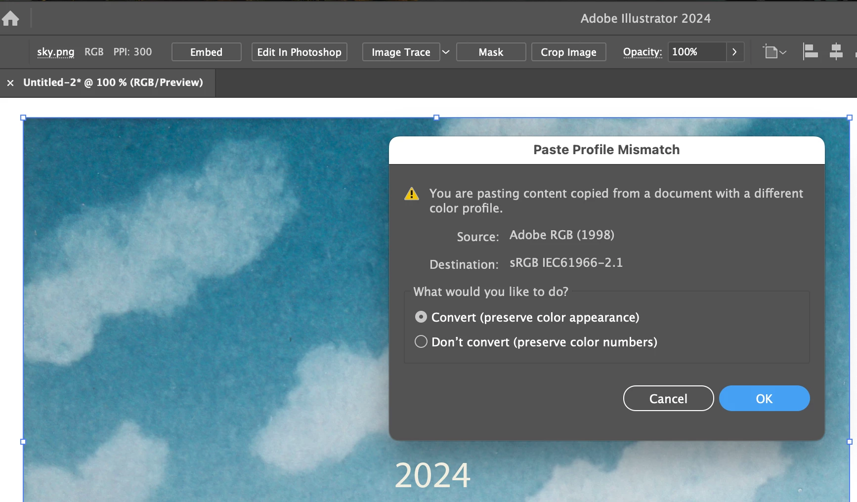 PNGs with Adobe RGB profiles now shift color when embedded in Illustrator.