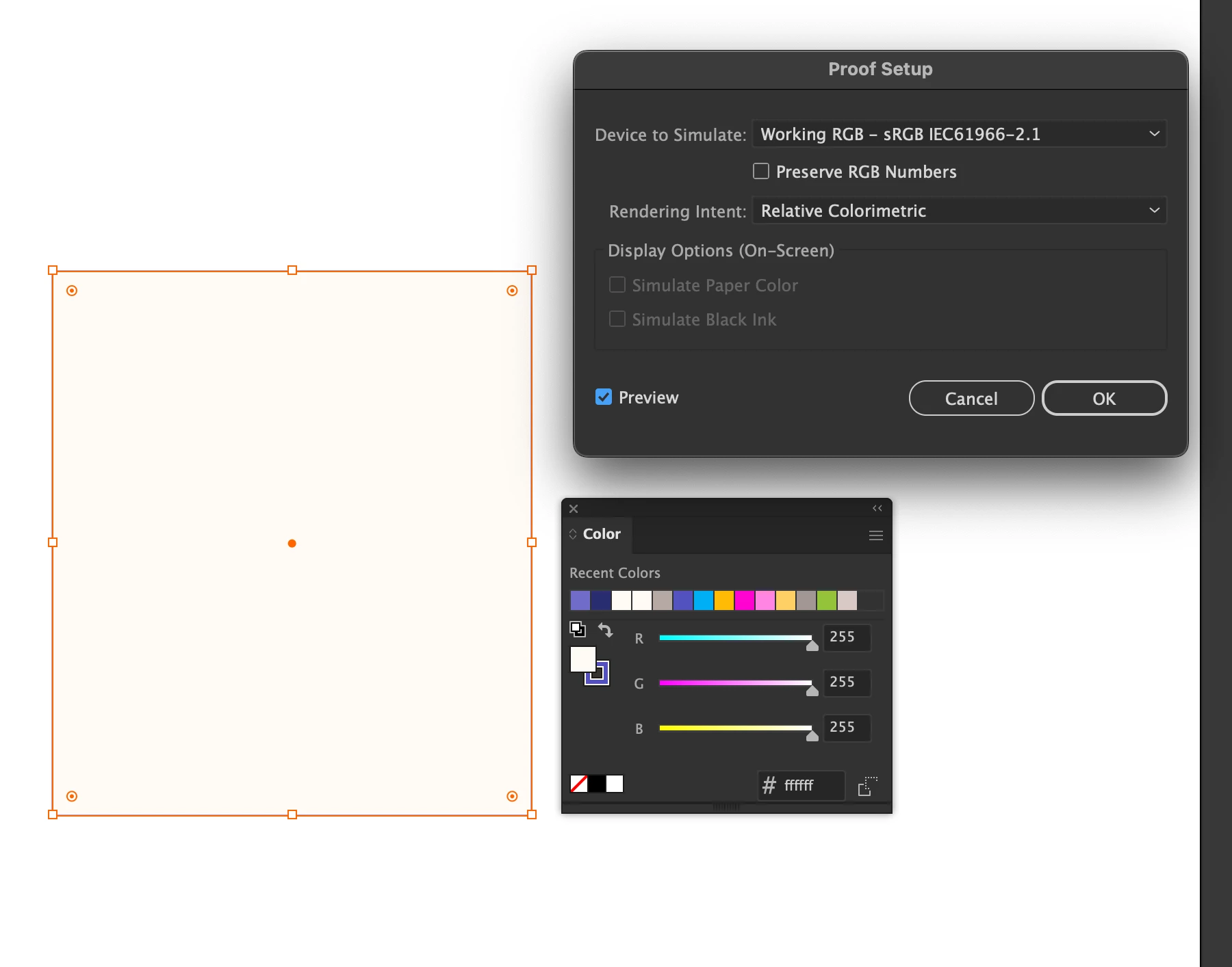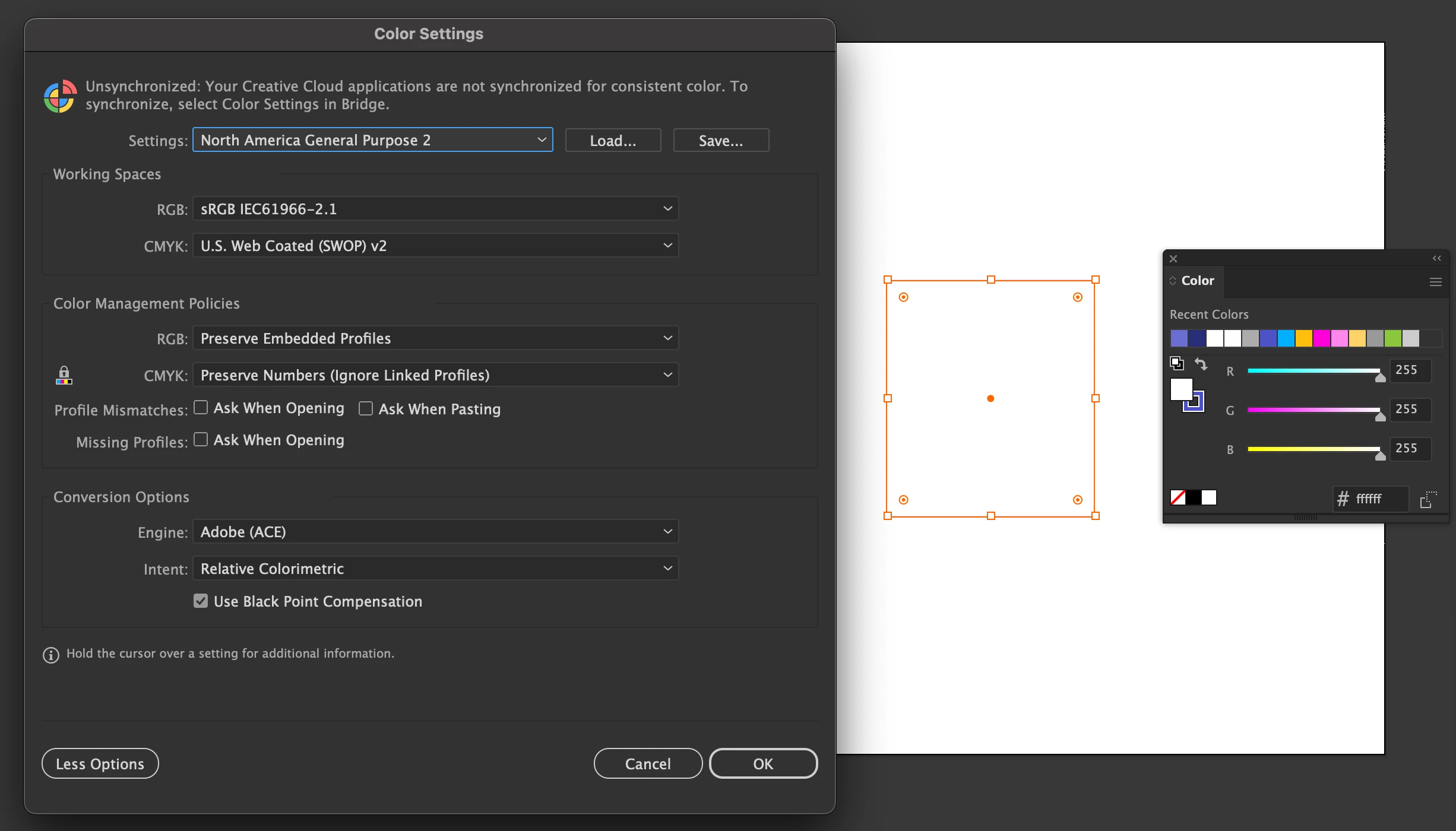 Below is an artboard from the same document with a rectangle in pure FFFFFF white + the Colour Settings as well as the exported result with the yellowed rectangle.