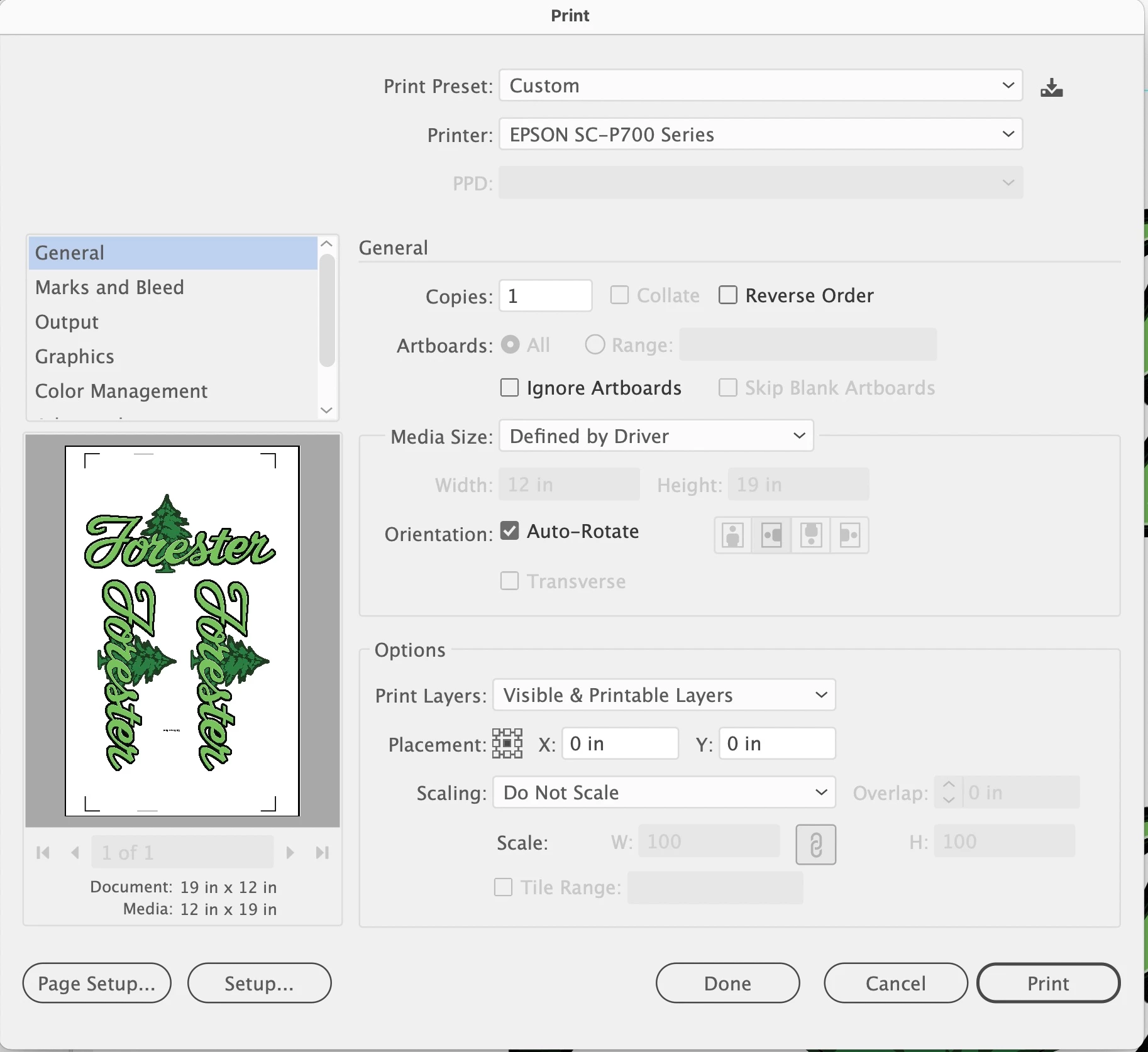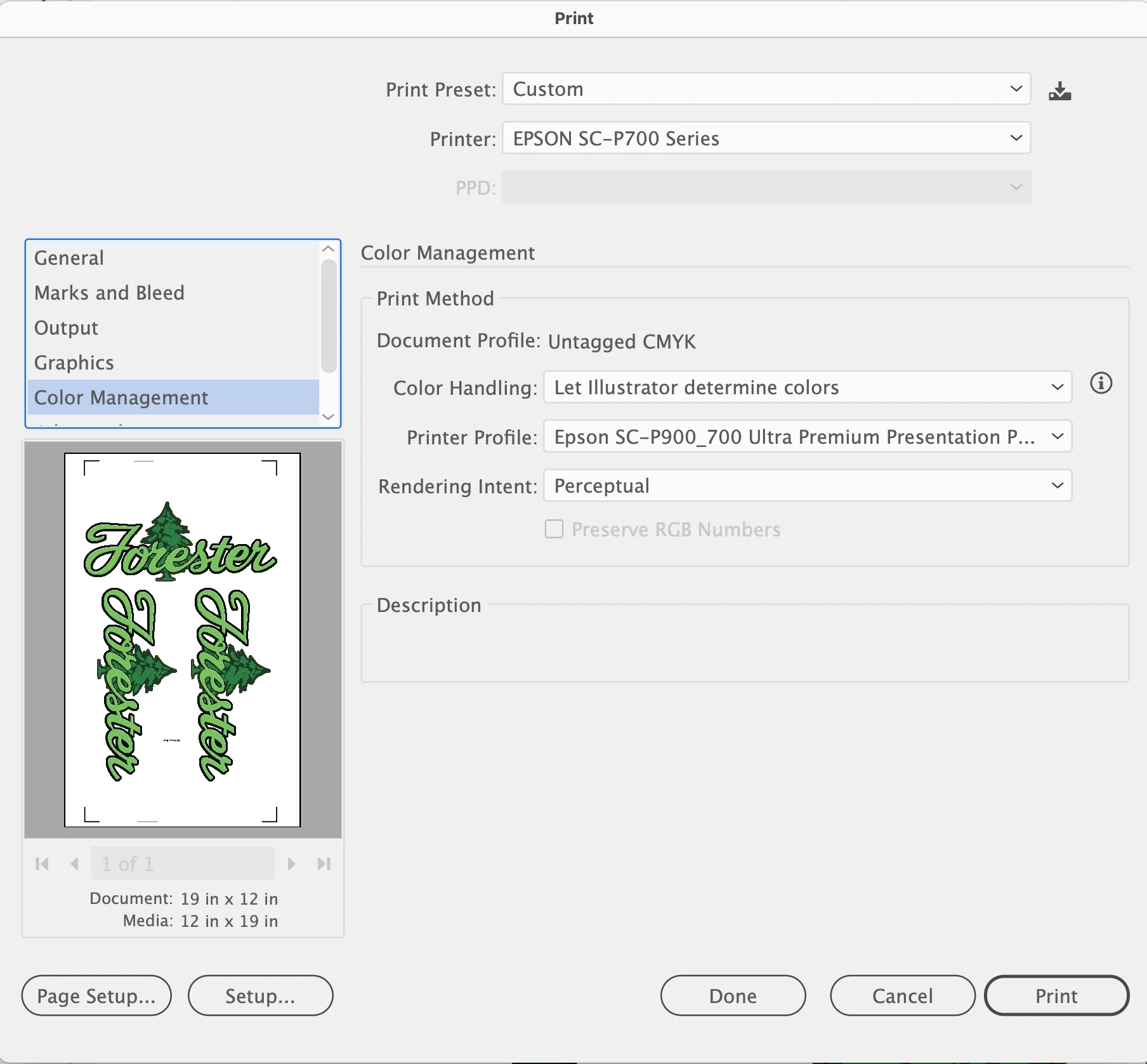 I’ve been printing out of illustrator 26.3.1 to an Epson p700 for a couple of years. The printed image has registration marks that a digital cutter reads in order to cut the printed shape precisely. The marks are black but the cutter is very particular on the color settings. If the image sent isn’t set exactly, the cutter doesn’t read the marks. I have no idea why, Epson has no idea nor does the cutter manufacturer, the marks all look black but only one file and printer set up will work. Believe me, I spent almost an entire week of trial and error finding the right settings.