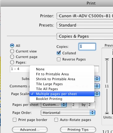 I've got a document with two A4 artboards, which I'm printing double sided on one sheet of paper. Could anyone tell me the easiest way to print it at A5 size, so I'll get two double sided copies per A4 pages?