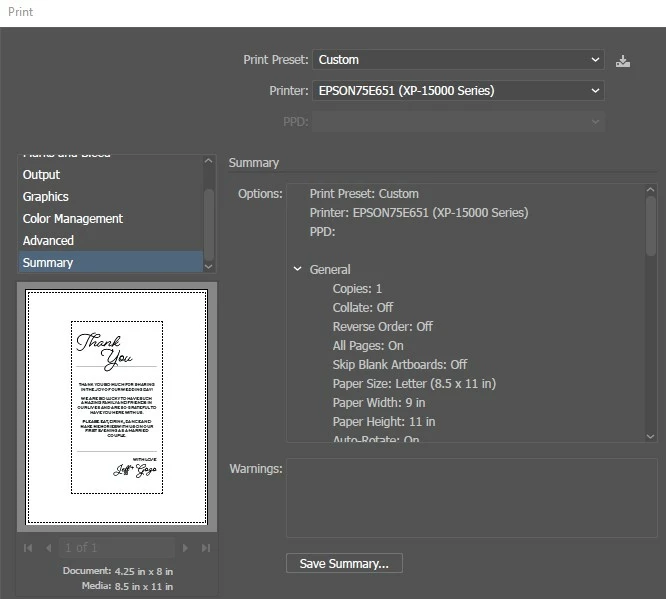 I am attempting to print a document from illustrator with document (artboard) size of 4.25in x8in on paper that is 8.5 by 11. I've set up the printer settings in illustrator to print on letter (8.5 x 11) however the paper width in my print summary is listed at 9 by 11 for some reason and all of my test prints so far have turned out one inch larger (5.25in x 9in). Does anyone know how to correct this or where I might ahve gone wrong?