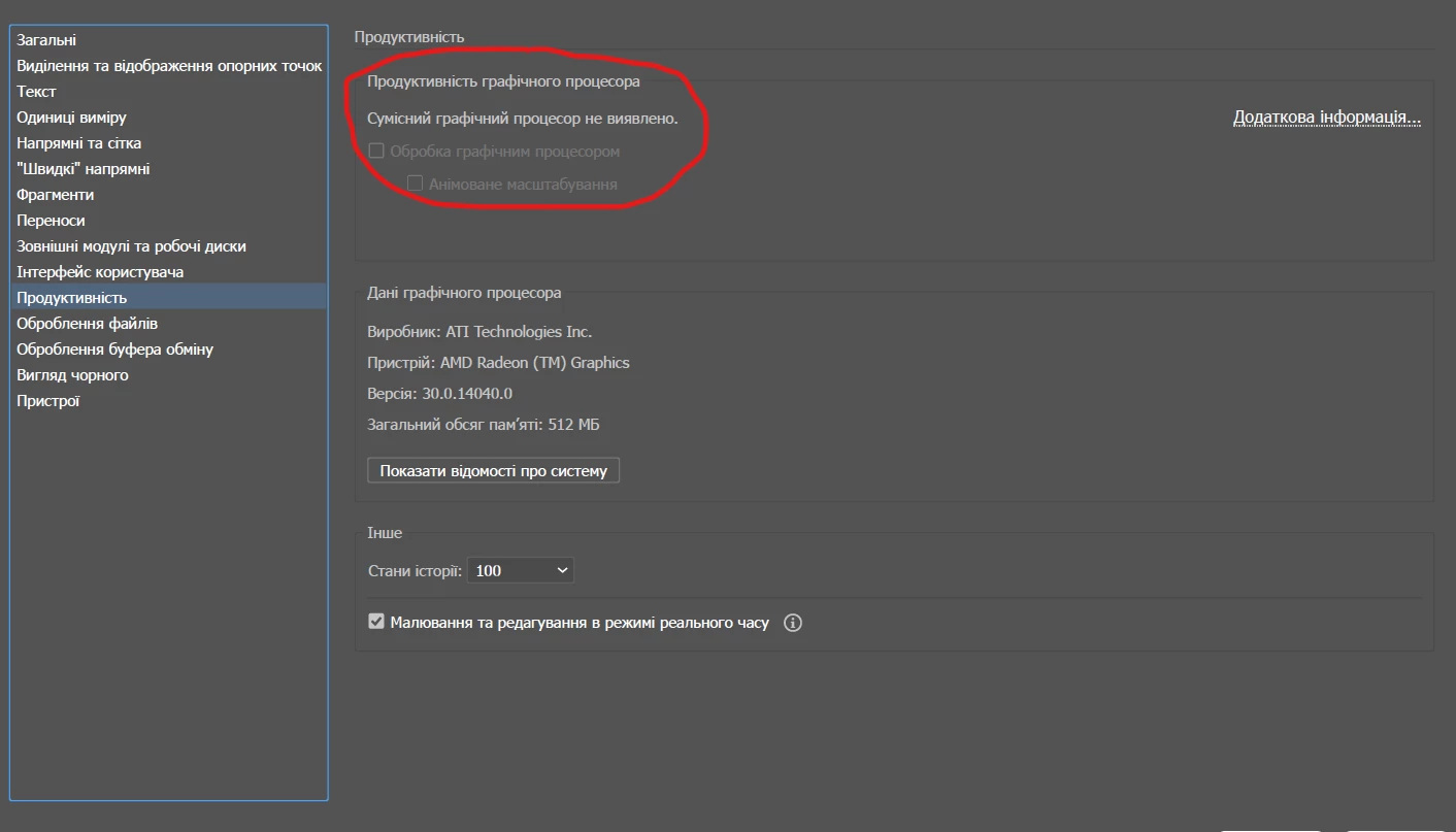 Good afternoon. I'm facing the following problem. I have a Ryzen 5 5625U processor with Radeon Vega graphics. In the system settings in the performance section, I see that Adobe Illustrator does not see my graphics accelerator (Compatible GPU not detected). I will attach a screenshot. Because of this, in a 3D task, when processing, the load goes to the CPU, while the GPU is loaded at 0%. Help me solve the issue