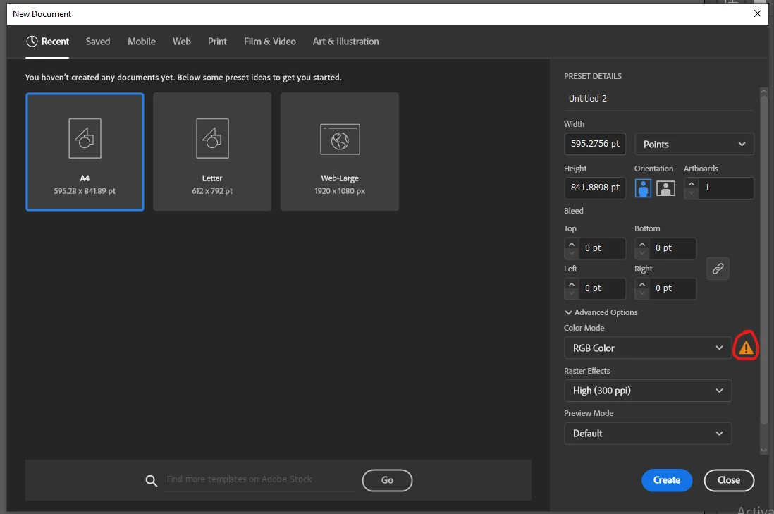 Al escoger RGB para un nuevo documento me salta ese cartel de alerta, además de que al exportar en un color el resultado no es el esperado