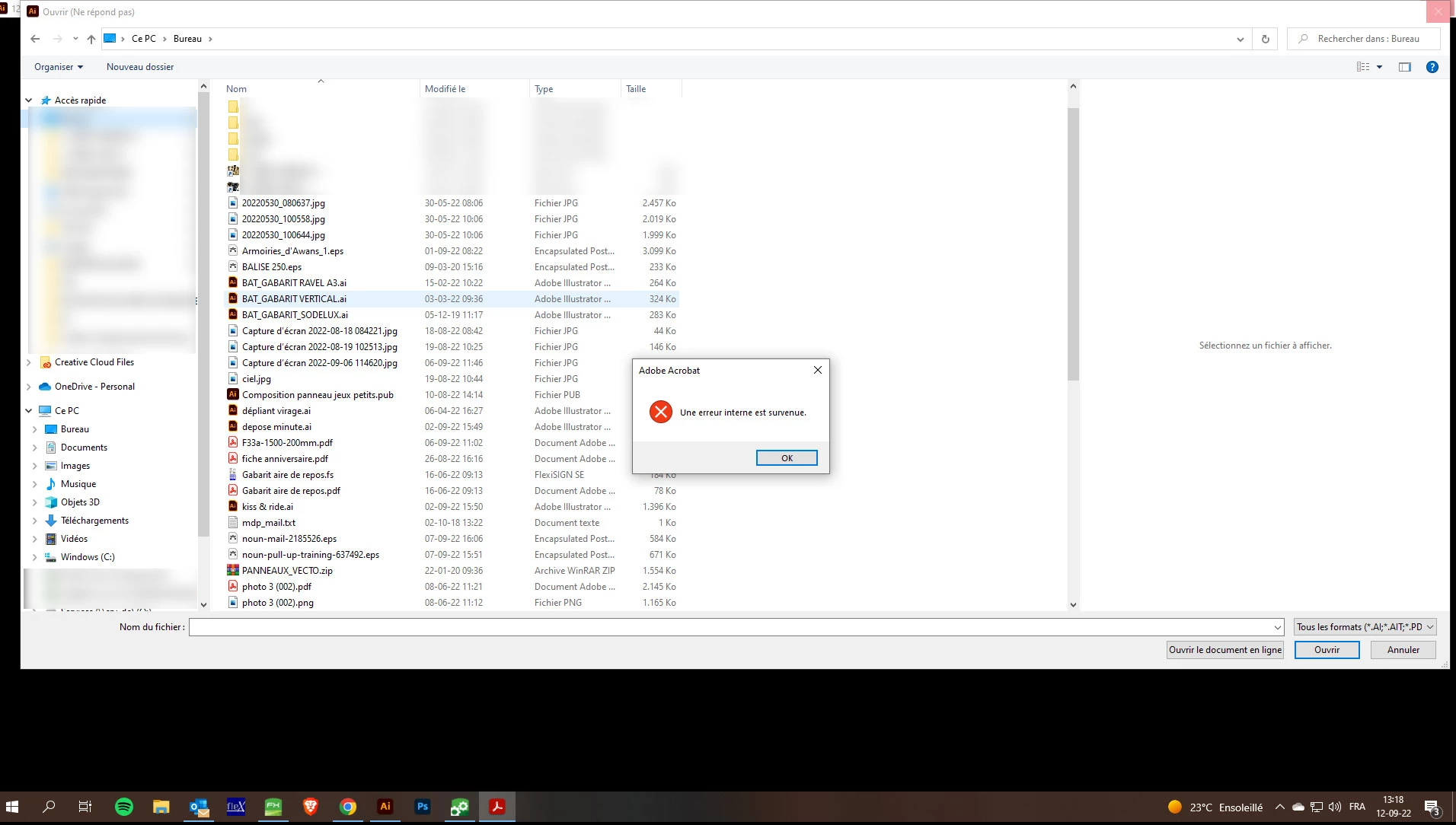 Je me permets de poster ici car depuis quelques semaines je rencontre un soucis plutôt désagréable lors d'une utilisation professionnel d'Adobe Illustrator. Au taff, j'ai deux PC utilisant le même compte Adobe (On a une formule entreprise du coup). Sur mon PC, je ne rencontre strictement aucun problème, tout fonctionne du feu de Dieu. Cependant, sur l'ordinateur de ma collègue, c'est plus compliqué. Depuis quelques semaines, elle rencontre un soucis lorsqu'elle veut ouvrir un fichire via le panneau "Ouvrir". Effectivement, une fois sur deux, lorsqu'elle clique sur un fichier pour l'ouvrir, la fenêtre plante et un message d'Acrobat rapplique en expliquant "Erreur interne". Une fois que ça a finit de planter (après une dizaine de secondes) elle peut quitter le message et le fichier finit par s'ouvrir.