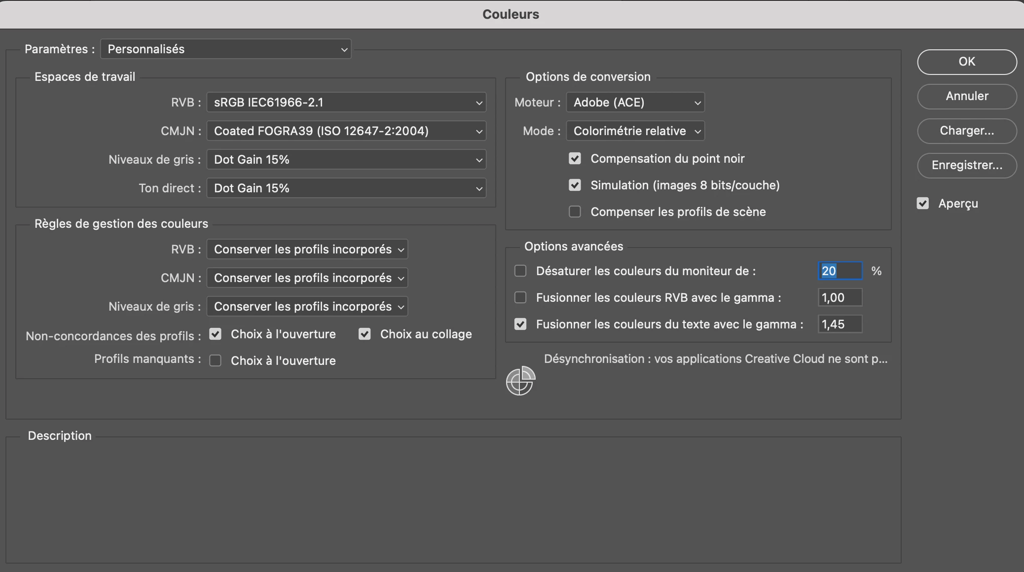 le boulot m'a donné des fichier illustrator qui s'ouvrent en couleurs dans Illsutrator. J'en ai besoin sur photoshop donc je les sauvegarde en PDF avec les options qui s'affichent autamiquement (PJ). Seulement, quand j'ouvre les PDFs sur Photoshop, ils sont noir et blanc en niveau de gris, je ne sais pas pourquoi. Les PDF s'ouvrent bien en couleurs sur Apercu du Mac donc y'a un souci sur comment les formats .AI ont été enregistrés par la personne qui les a crée mais je ne la connais pas.