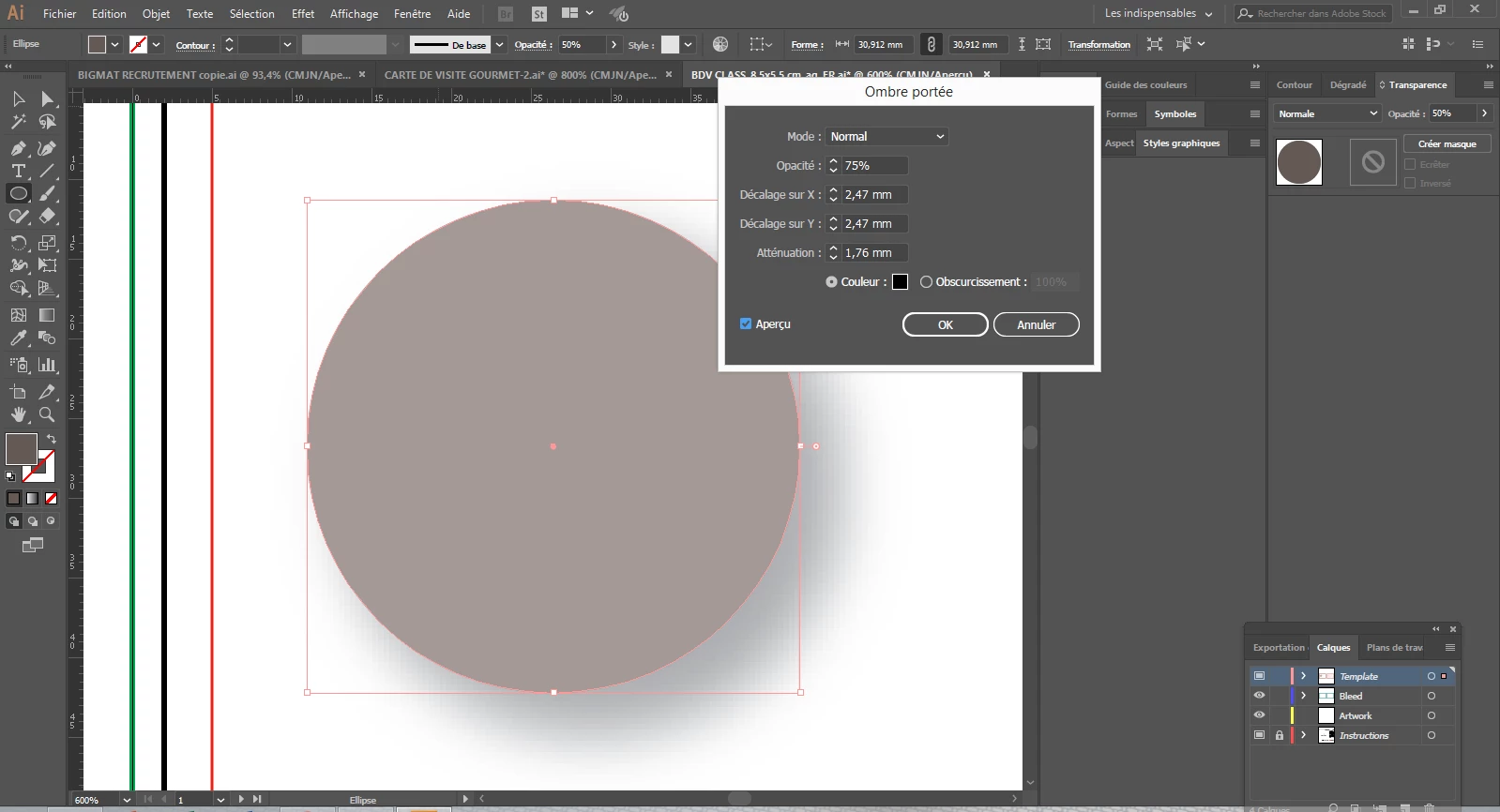 Dans le cadre de la création d'une carte de visite, je rencontre des difficultés quant à la création d'ombres portées.