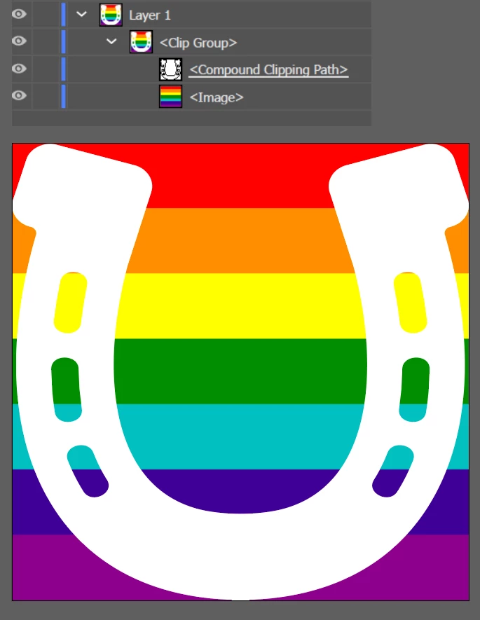 Now I need to take that complex horseshoe Compound Path and fill it with an image. I haven't been able to make that happen. Keeping the horseshoe compound path on top I tried the following: