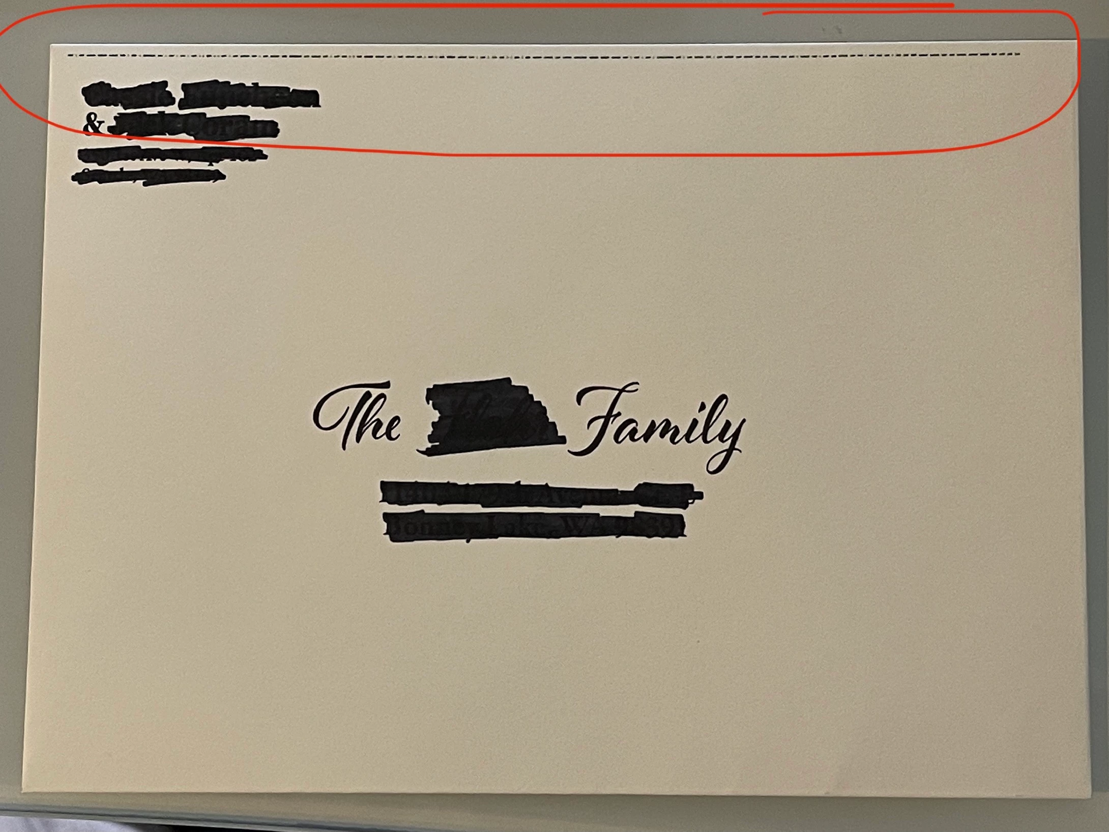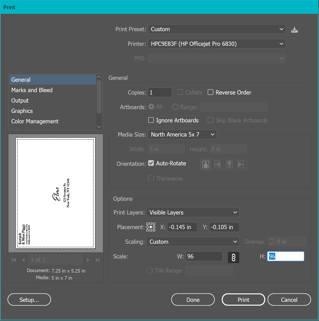 I'm trying to print these envelopes and I keep getting a random line in the print that is nowhere in the design. I don't know if it's an over print warning or something else. Any ideas on what it is and how to keep it from showing up in the print? Picture attached.
