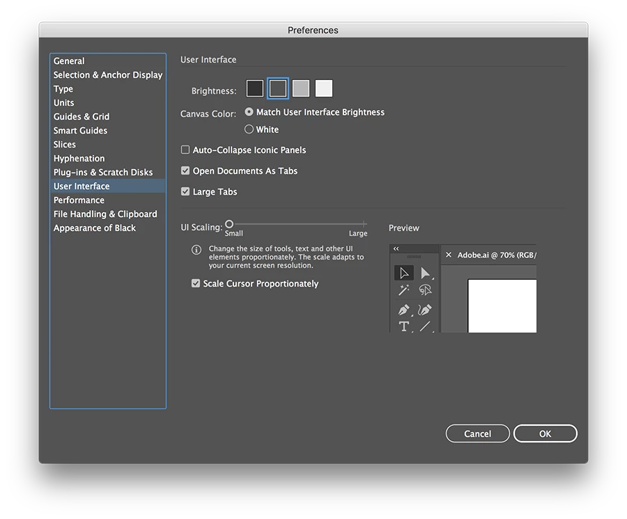 Recent upgrade has upsized the Illustrator interface, I want the old size back.