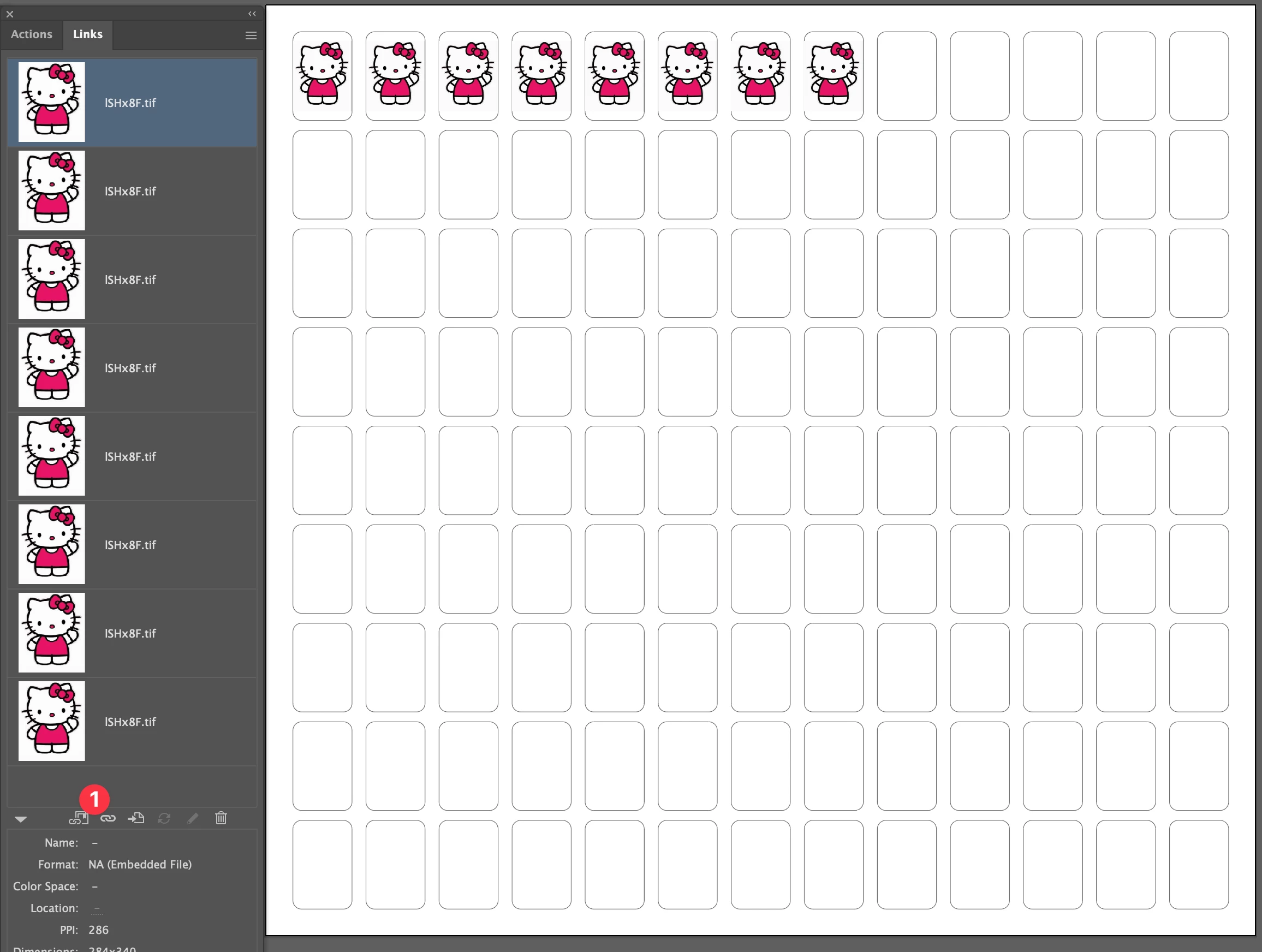 There are 117 images that can be on this page. In my example, I show eight images, which I would like to be able to change all of the images to a different image in one or two strokes. Currently I go to the links window, and select all of the images in the panel. I've been select the link button at the bottom of the window and the file window appears at which time I select my new image and it updates the document. Unfortunately, in the case of this document, in order to change the image I and presented with the file window up to 117 times (in the case of this document) to select an image to replace.