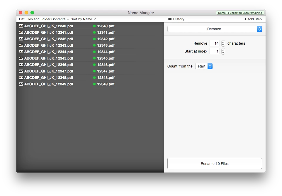 My ultimate goal is to be able to build that single functionality of Name Mangler into the existing script I posted above. Now, the catch is that I ONLY need it to affect the file created by the section of Lines 66-71. As you can see, I need it to remove 14 characters from the filename starting at the index.