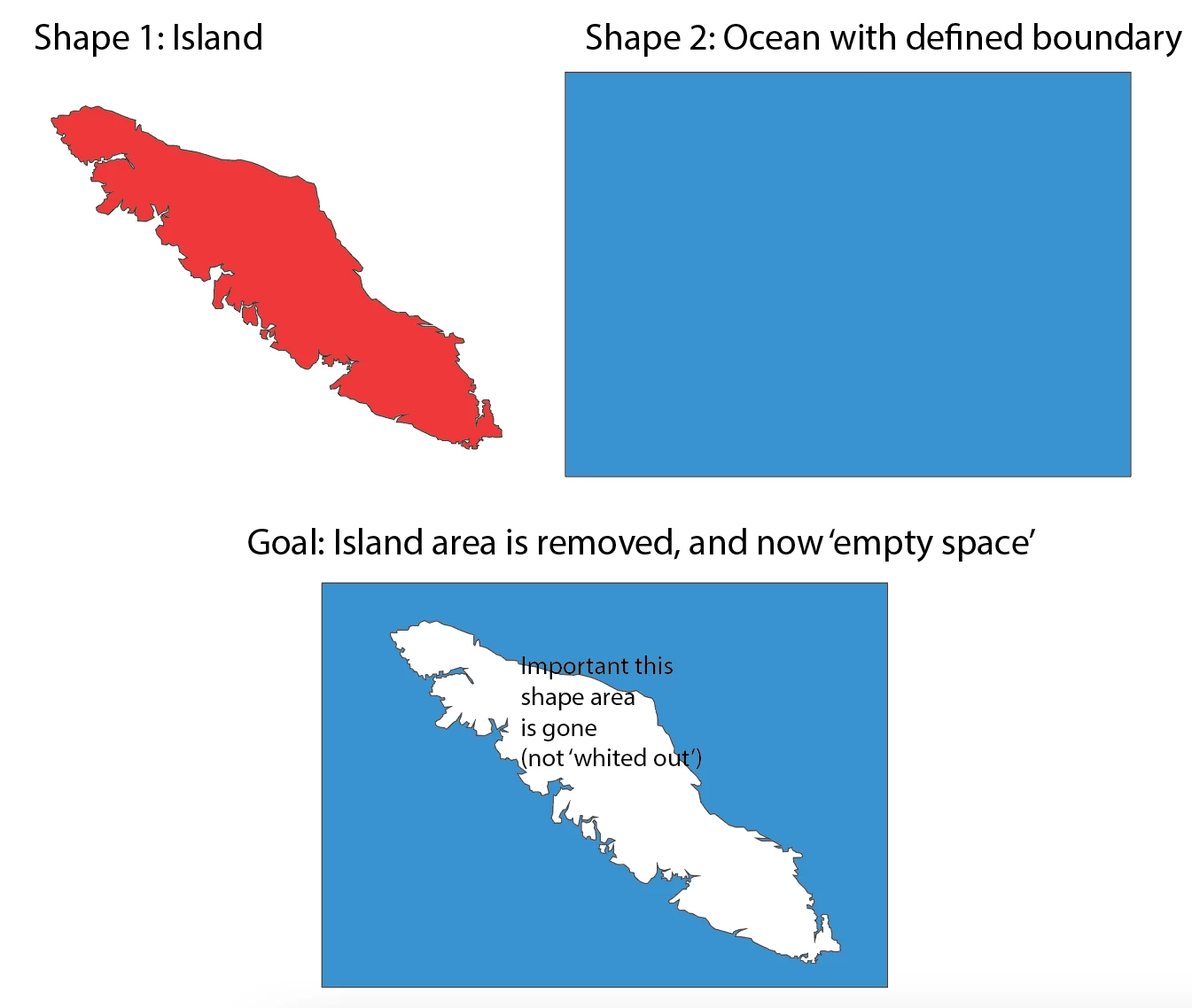 I am trying to remove a region with a very specific shape - basically like the reverse of a clipping mask (but most similar issues point me to an opacity mask, which doesn't seem to help). Basically I want to remove a specific shape (shape 1 = island below) from another shape (shape 2 = ocean below). It's important the island is completely removed, only surrounding ocean ('box') is left. Such as: