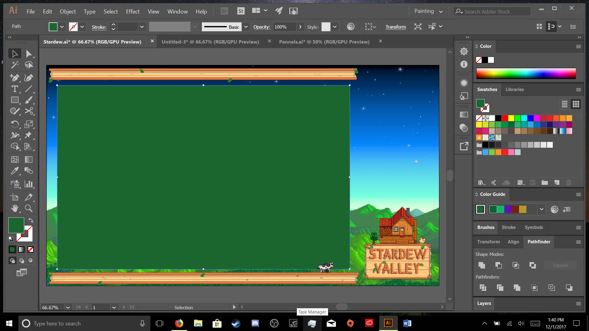 Ok, I'm fairly new to Illustrator and I have spent hours searching for how to correct the issue I'm having but I haven't been able to find a solution (even though I know it must be simple enough). I have an image and I want to take out a portion of the background in the center. I've tried the minus front/back thing. I've also tried the clipping mask and Knockout. Any suggestion would be greatly appreciated! The green box is the area I am trying to open to the artboard. .png)
