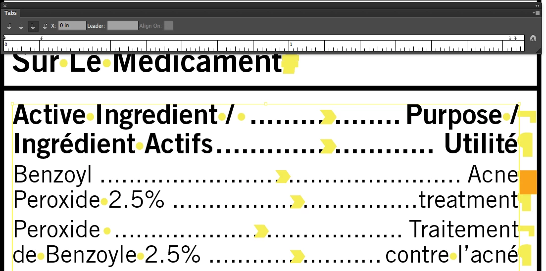 As you'll see in the attached, I have dots going from one word to another using tabs created by putting a period in "align on". I'd like to maintain those tabs but remove the dots. However, I can't seem to remove the dots. I thought I could just select the type and delete the period from "align on" but its grayed out. How can I resolve this?