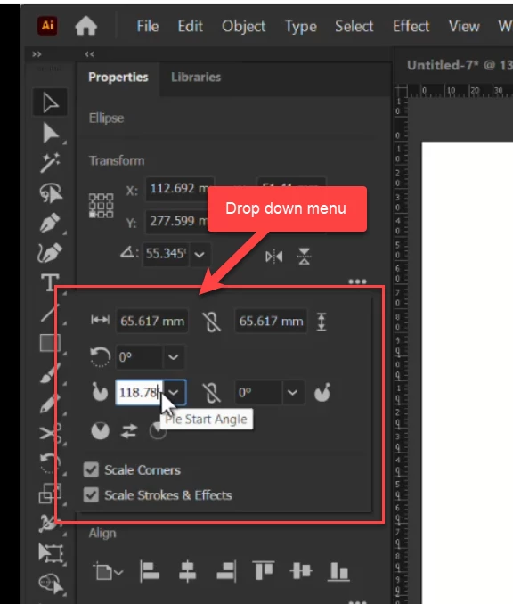 Tranform drop down menu disappears when shape is active. In the artboard when I change the value of the Pie Start Angle by rotating the point on the line, drop down menu disappears. How to retaining the drop down menu?