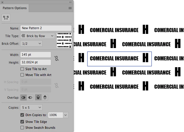 2. In the Patern panel options choose brick by row, Brick offset 1/2, then adjust the width number till you have the distance you want from the H letter and the text, when done hit Esc, your pattern is ready on the swatches pallete