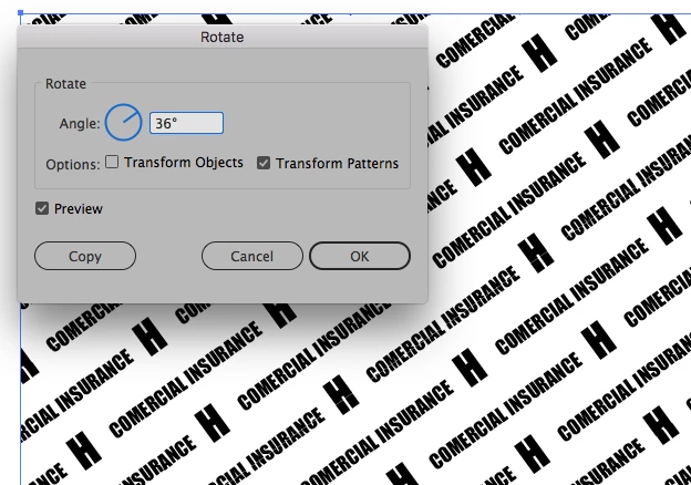 3. Now draw a rectanle any size you want and aplly your pattern, double clik on the Rotate tool and select any angle you want but be sure to unchek Transform object, this only rotates the pattern leaving the object alone.