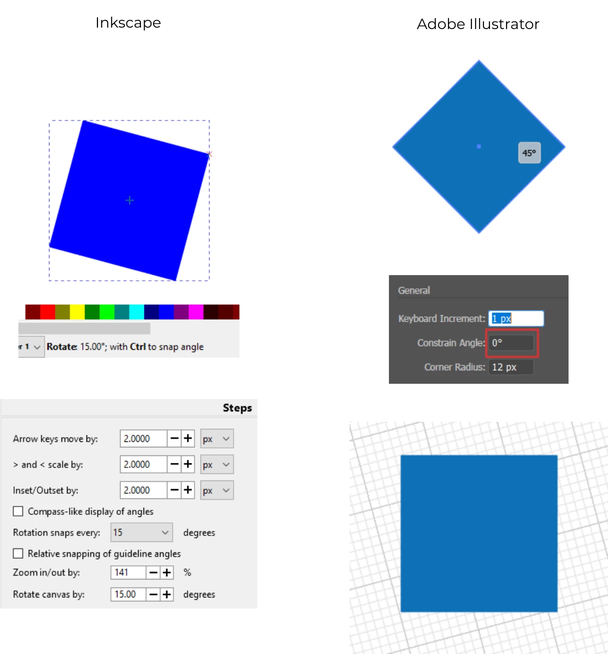 In Illustrator, on the other hand, the angle is set up to 45 degrees by default, and I don't know how to change it. In the General tab in the Preferences window, I found the Constrain Angle option. When I set it up to 15 degrees, it works fine - I can now step rotate my objects by 15 degrees. But it comes with an issue - all the boards are rotated by 15 degrees as well (on the picture at the right bottom you can see the grid - it is tilted). Is there any other way to set the default angle of step rotation without changing the orientation of the working space?