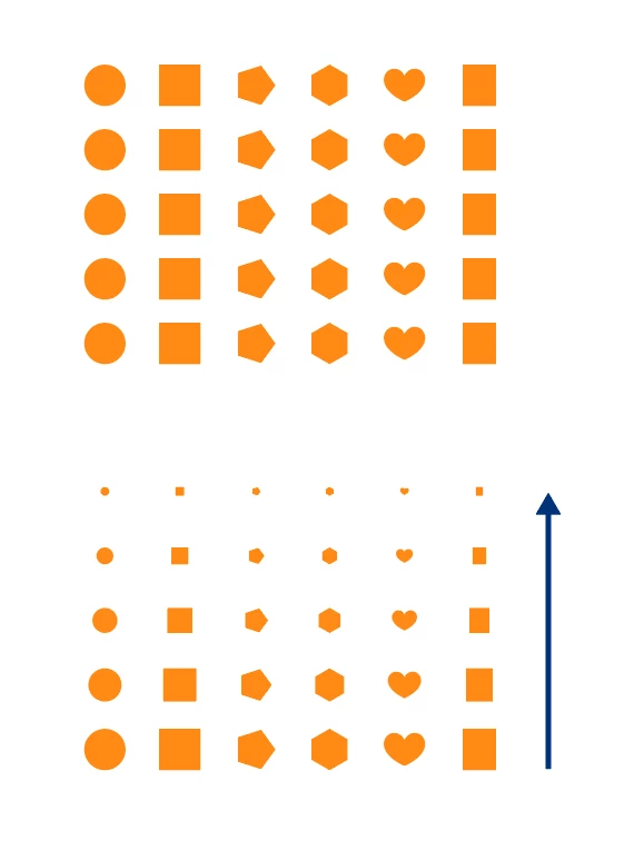 I am looking to achieve this result with a group or many items. The scaling should happen along a direction and if possible radial too. The objects can be randomly arranged too. I need the scaling to follow from high to low.