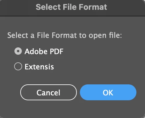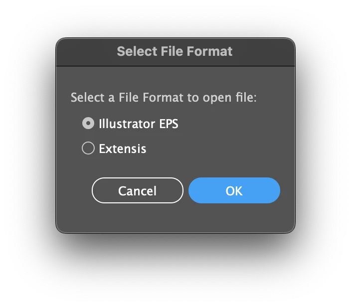 I recently started getting a "Select File Format" dialog when opening anything other than an Illustrator ".ai" file. I expect an import options dialog when importing text or Word docs, CAD files, even PDF or similar. But anything associated with Illustrator like SVG, PDF, or EPS should not give me this extra step. What's really confusing, "Extensis" is listed as a file type. How do I fix this?