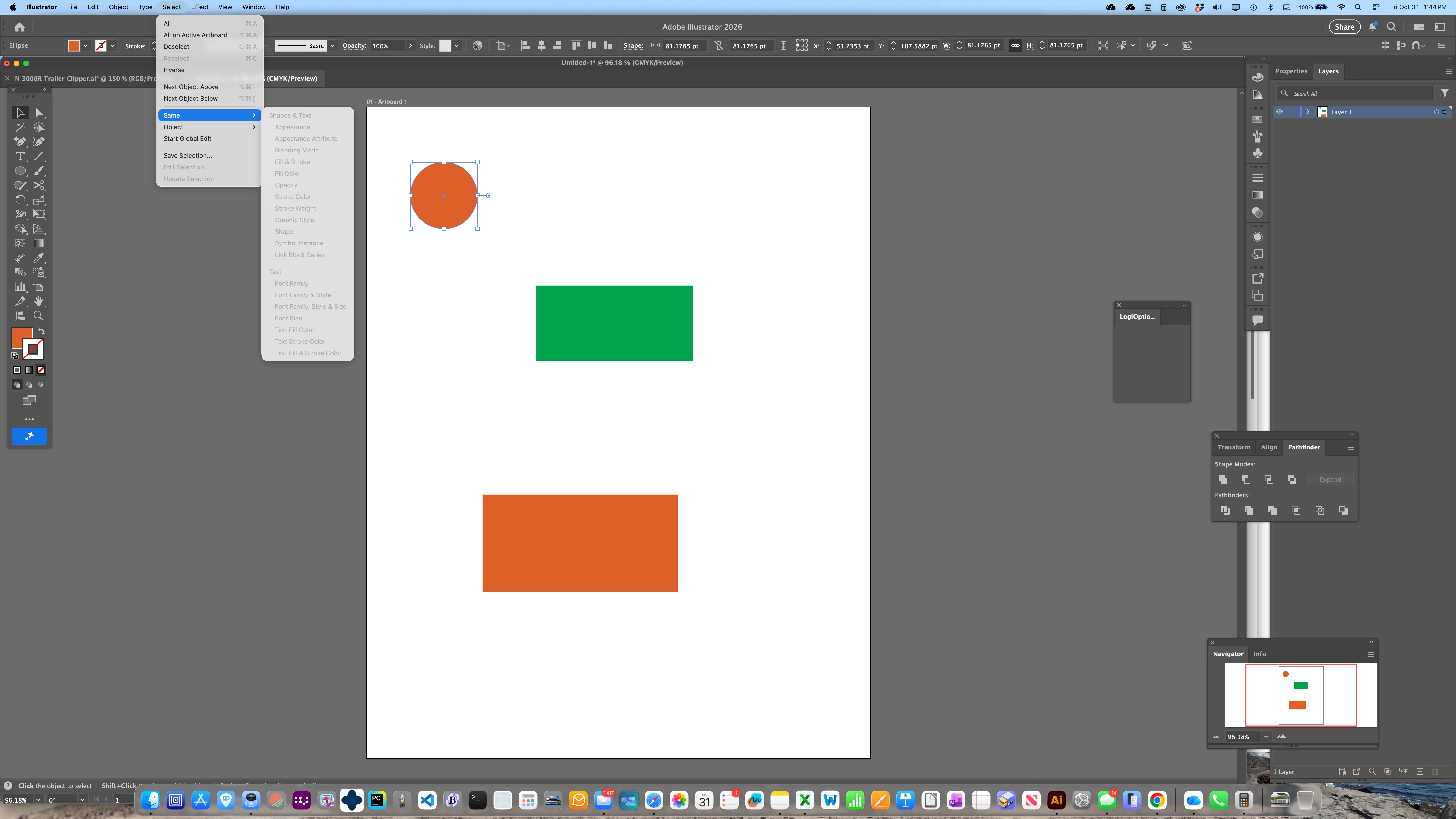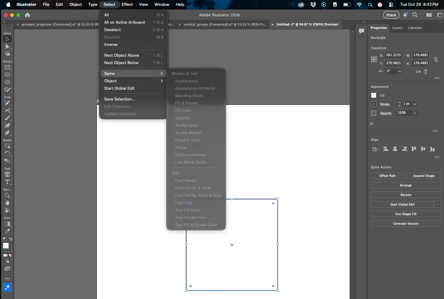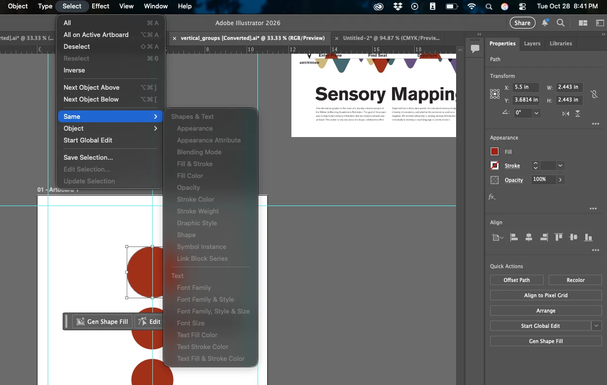 I have exported various circles of different stroke colors from Rhino to Illustrator. I am trying to change similar stroke types as I have many times before on my previous computer with no luck (Select > Same).