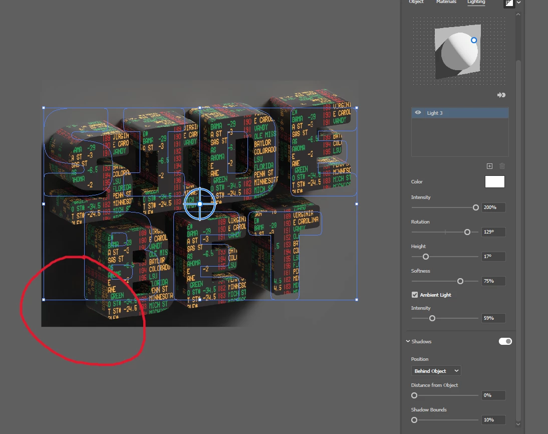 I am making a 3D logo and the shadow is being "clipped" by the selection box. This is my first time using 3D with Ray tracing... Is there something I am missing? Thanks!