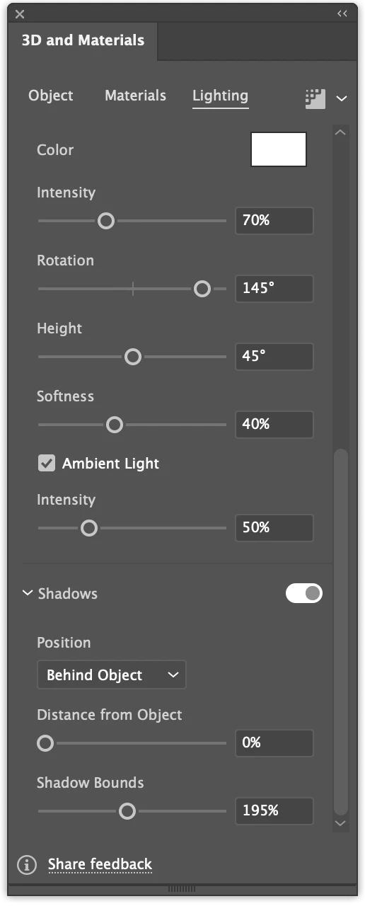 I was trying to add shadows to the inflated 3d object but i won't see the shadows option at all, can you please help me with this situation?