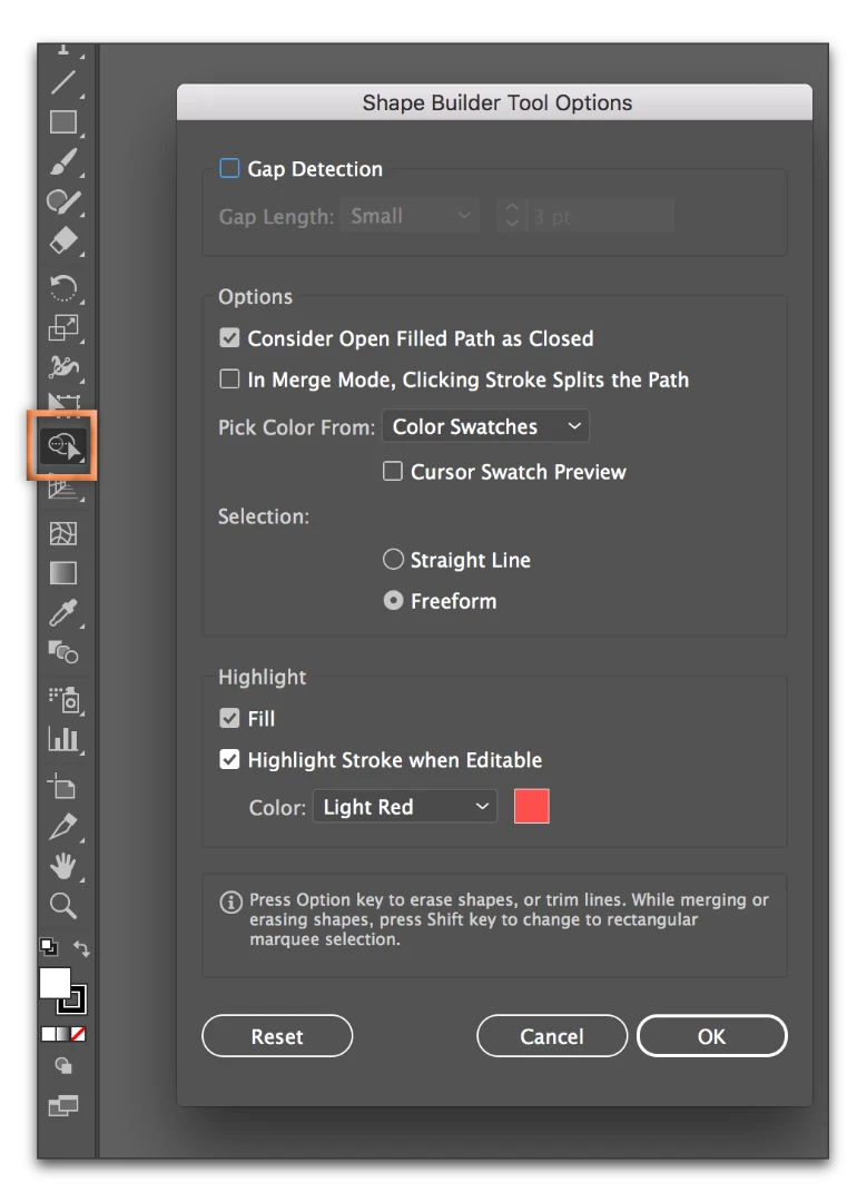 I am following a tutorial in the Adobe Illustrator CC Classroom in a Book. I need to double click on the shape builder tool to open an options box which just doesn't happen. I believe I've tried everything but it's still not working. Can anyone shed some light on this please? Is there another way to select it?