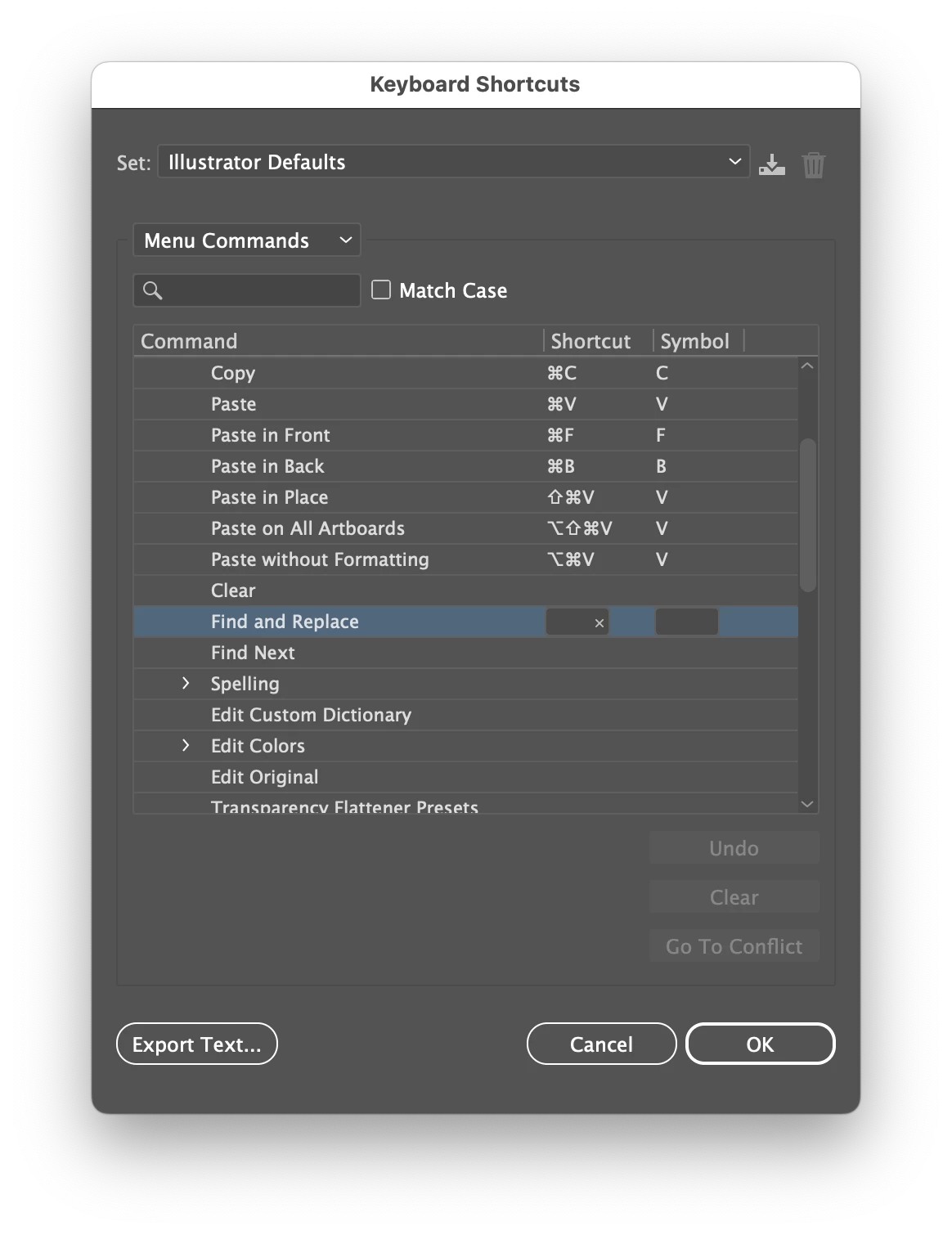 I’m currently using Illustrator version 29.1, and I noticed that the “Find and Replace” option is missing from the shortcut menu. I’d like to assign a keyboard shortcut to this option, as I did in the previous version, but I can’t seem to find it. Has anyone else experienced this issue? And is there a workaround?