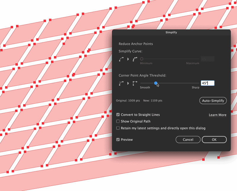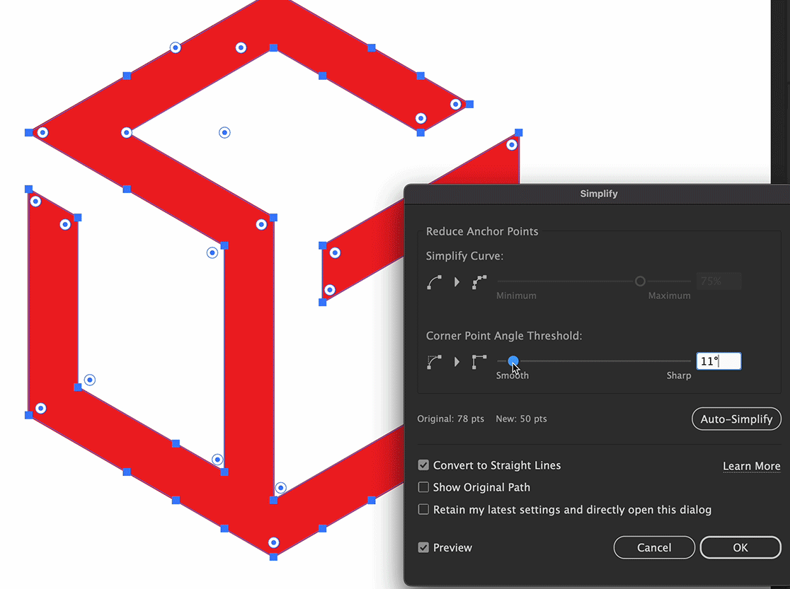 I saw another post on this, about how the old simplify tool worked great, but the new one somehow is a step backwards. That post was over a year old and just today I ran into a situation that illustrates it well, so I'm asking again to work on the simplify tool: I wanted to delete excess points on a straight path on a 60 degree hexagon - but it doesn't delete nealy all the extra points before it deletes everything above 59 degrees, see GIF. Is it something with my settings? Or just the functionality of the tool?