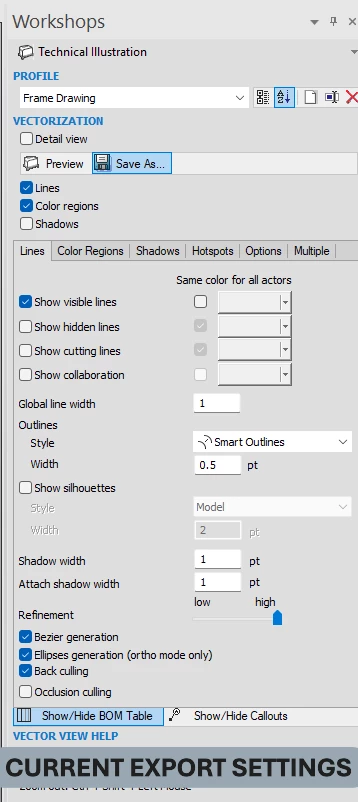 I have attached a screenshot of my Solidworks Composer file and the export settings, as well as what the end result is in Illustrator. Please, if anyone has any advice or tools I can use to make this a little simpler, I am all ears. I have tried Astute Graphics and while it is helpful in some cases, it doesn't do quite what I'm trying to accomplish.