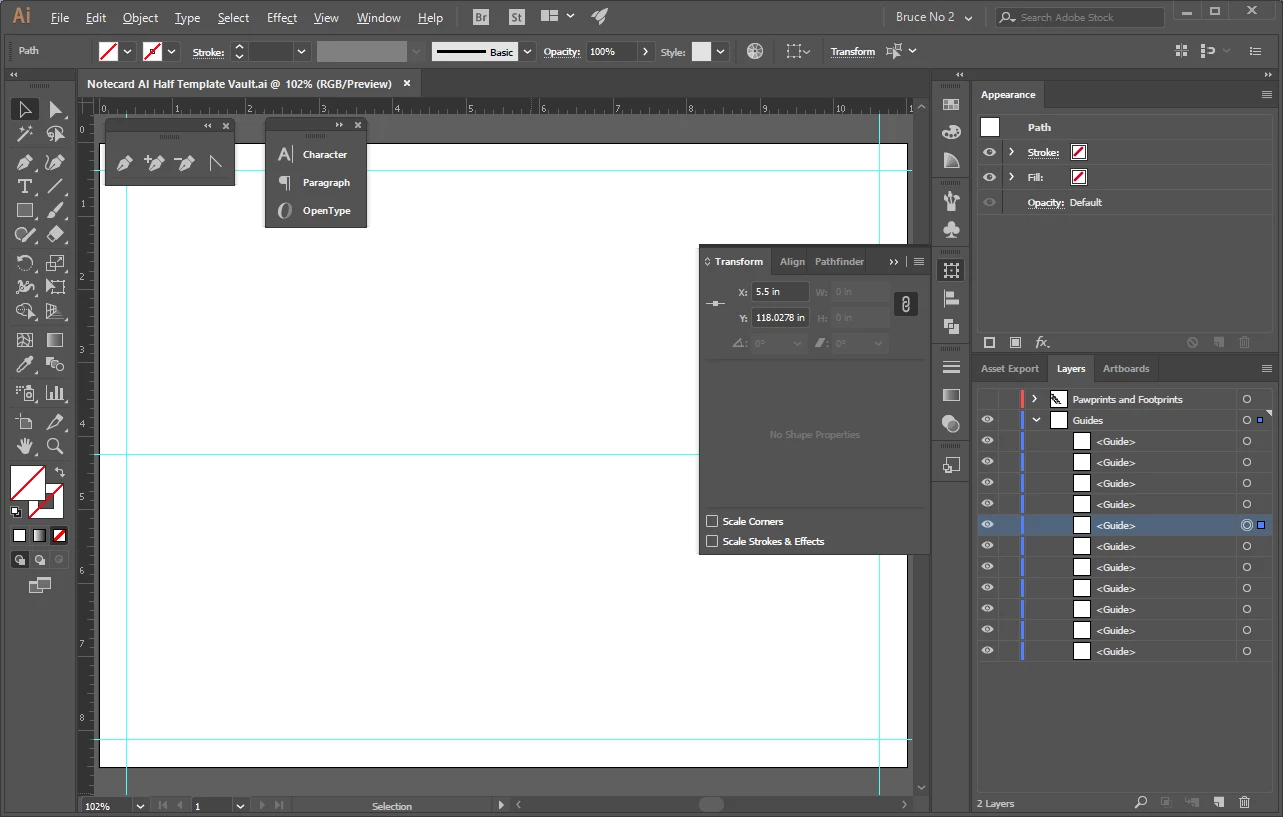- Illy "knows" the guide is there (see attachment) as one of them is selected and the TRANSFORM window shows it at 5.5 inches