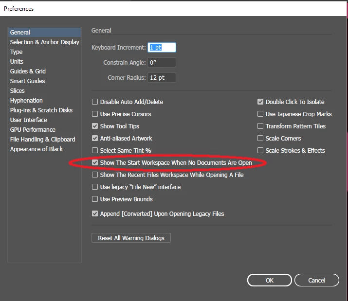 Start workspace in Illustrator CC 2017 missing
