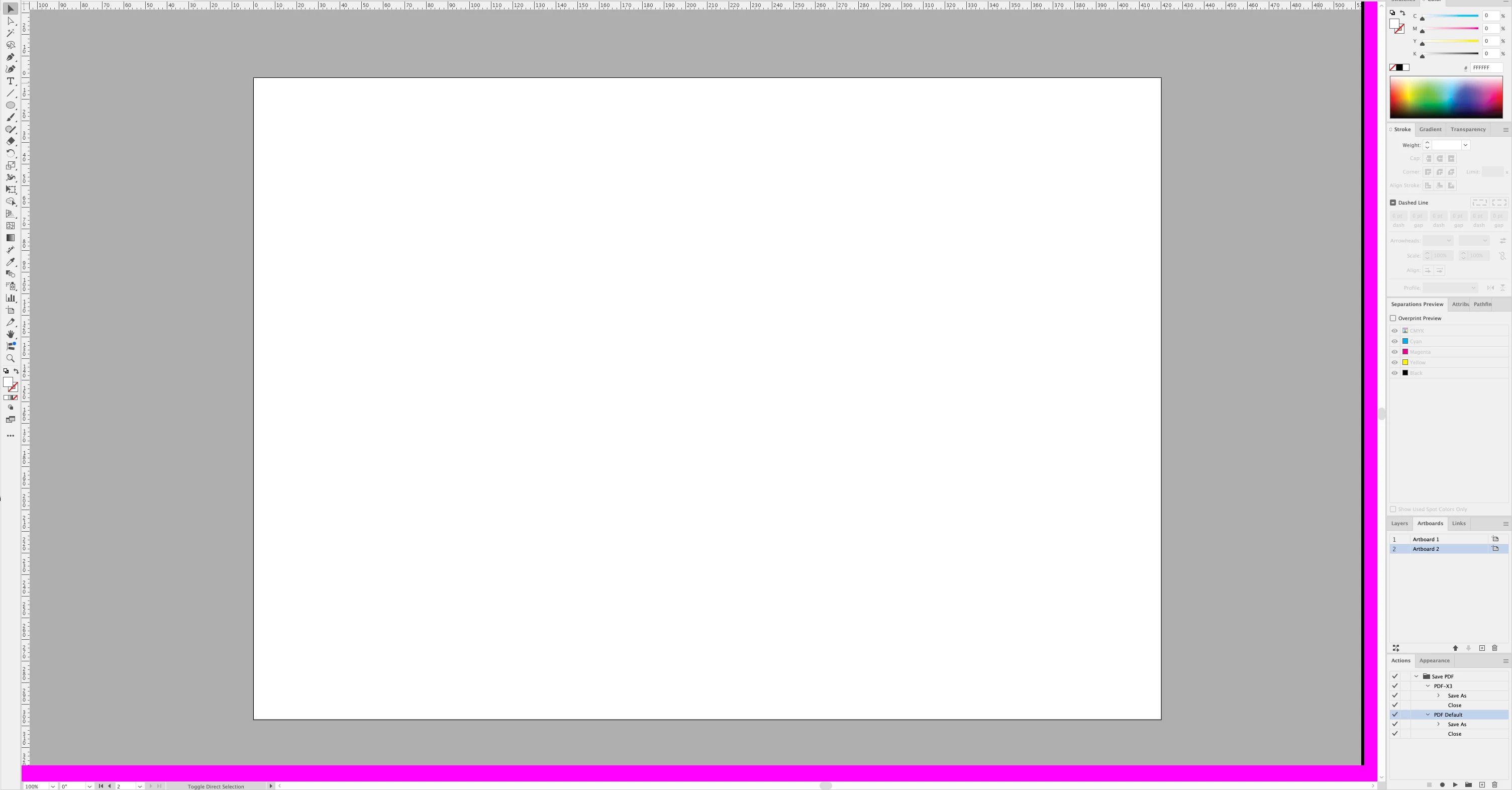 I have a number of strange things happening, which seems to be when opening my older created Illustrator files. One shows a completely white page, no content, until I zoom in or out then the document appears. And another where a thick pink line appears at the bottom and right of the window, screenshot attached.
